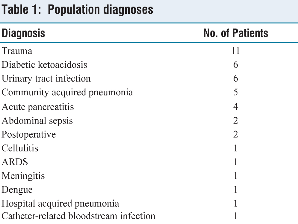 Fifty patients were screened and eight patients were excluded (four patients had atrial fibrillation and four patients had poor ECHO window). Among the 42 patients included for study, 34 patients had septic shock and 8 patients had hypovolemic shock. Sixty percent of the study population was male and 40% were female. Mean age of study population is 44.05 ± 11.3 years. Distribution of study population based on diagnosis has been shown in Table 1.