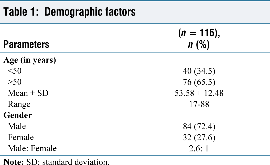 A total of 116 patients were diagnosed with RCC during the study period with a prevalence of 38.6%, which included 84 male patients and 32 female patients, accounting for 72.4% and 27.6% of cases respectively with a male-to-female ratio of 2.6:1. The age range of cases was between 17 and 88 years, with a median age of 53 [Table 1].