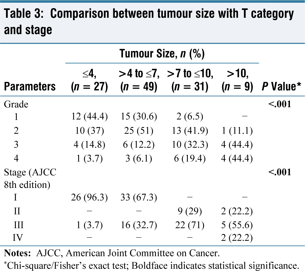 All partial nephrectomy cases were done for a mean tumour size of 3.89 cm, of which three cases (8.82%) showed microscopic extension into renal sinus, perinephric fat and segmental branch of renal vein, respectively. Another three cases showed parenchymal resection margin involvement on microscopic examination. Follow-up details were not available for these patients.