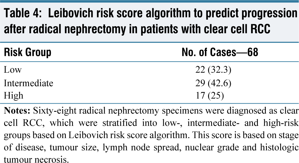 Clear cell RCC was the major histologic type (83.6% of cases), followed by papillary RCC (7.8% of cases). Lymphovascular invasion within the nephrectomy specimen was present in 13.8% of cases; however, this has no value in clinical management. Regional lymph nodes (hilar and aortic nodes) were identified and submitted in 72 cases, of which only 3.4% of cases showed lymph node involvement where the nuclear grade 4 predominated [Table 2]. Further correlation of the nuclear grade and tumour size, the WHO/ISUP grade 2 predominated with 42.2% of cases, of which 51% of cases the tumour size ranged between >4 and ≤7 cm. Pathological Stage I constituted 50.9% of cases with 33 cases ranging between >4 and ≤7 cm (T1b), and the remaining 26 cases were ≤ 4 cm (T1a). Clear cell RCC predominated in aggressive features such as vascular tumour thrombus, lymph node infiltration, involvement of renal sinus fat, perinephric fat and Gerota’s fascia involvement [Tables 2 and 3]. The Leibovich Risk Score algorithm was used to stratify 68 radical nephrectomy specimens into low-, intermediate- and high-risk groups after they were diagnosed as clear cell RCC [Table 3]. Tumour size, lymph node spread, nuclear grade, histologic tumour necrosis and disease stage all affect this score. Twenty-two, twenty-nine and seventeen of the 68 cases fell into the low-, moderate- and high-risk categories, respectively. This scoring predicts the progression after radical nephrectomy in these cases [Table 4].