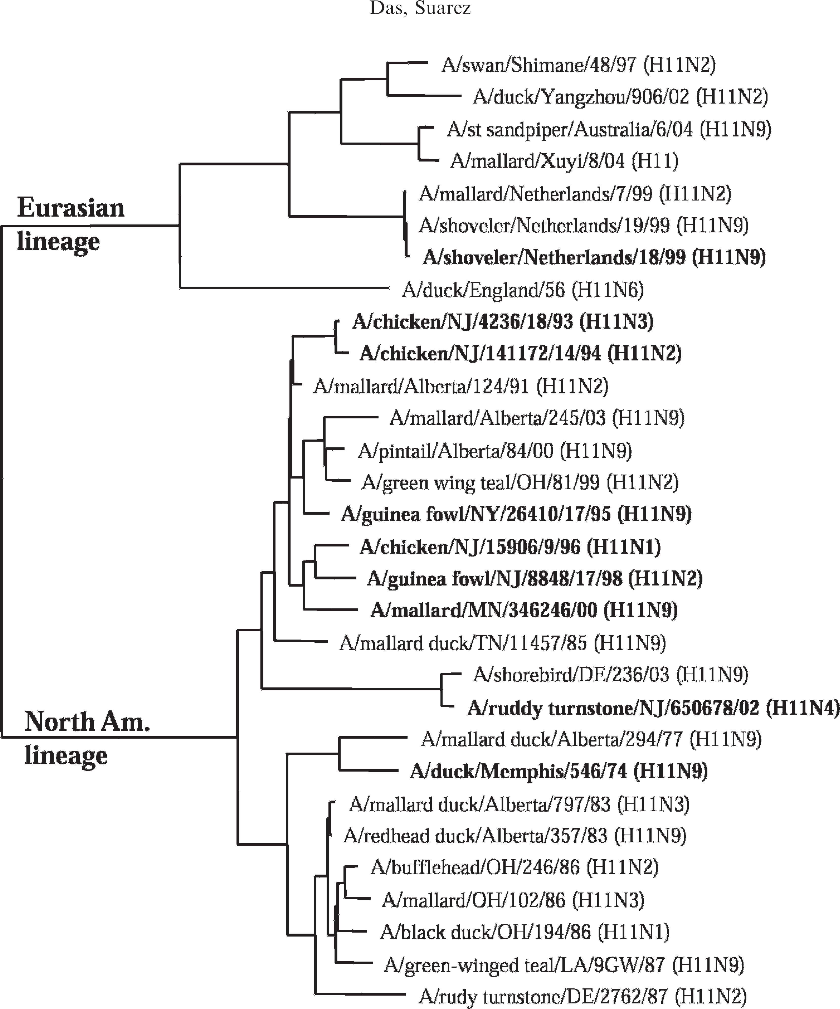 Phylogenetic tree of the different isolates of the avian influenza virus H11 subtype from North American and Eurasian origins based on the nucleotide sequences of their hemagglutinin genes. The sequences were aligned by Clustal W method using the MegAlign program. e The tree was constructed with phylogenetic analysis using parsimony neighbor joining midpoint rooting. The sequences used in the alignment were derived from either the influenza sequence database or in-house sequencing (in bold face) as reported in this study. States were abbreviated by their 2-letter postal code.