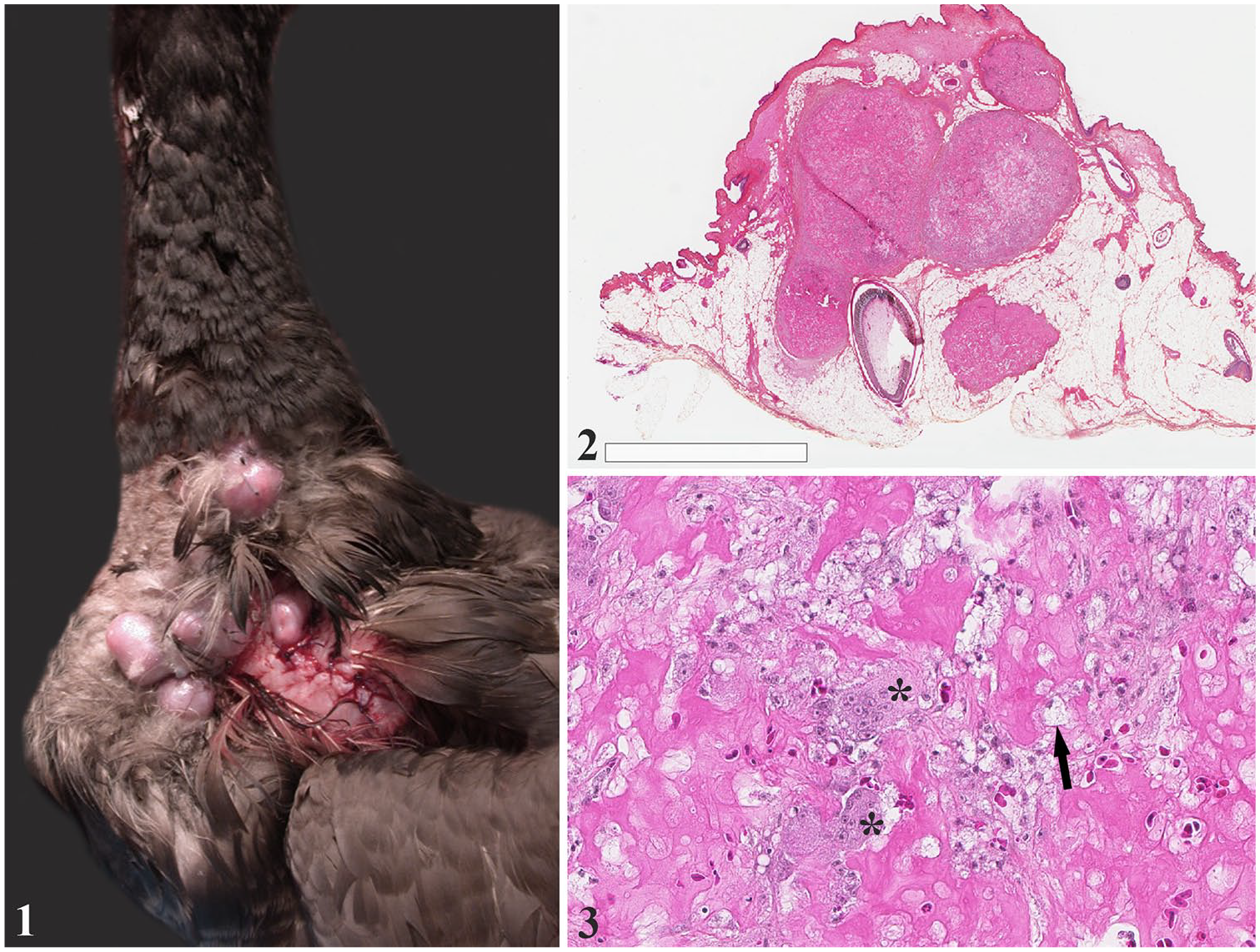 Under microscopic examination, a well-delineated, multilobular, granulomatous dermal mass surrounded an intact feather follicle (Fig. 2). The mass was primarily composed of large lakes of proteinaceous fluid and fibrin that contained foamy macrophages and multinucleate giant cells (Fig. 3). Foci of hemorrhage and necrosis were scattered throughout the mass. Follicular debris was not observed on the examined slides. No fungi or mycobacteria were seen with the PAS, ZN, and FF stains. Fungal and bacterial cultures yielded no growth.