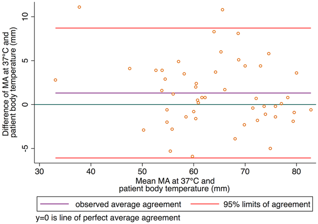 Bland–Altman plot comparing thromboelastography maximum amplitude (MA) analyzed at 37°C and patient body temperature.