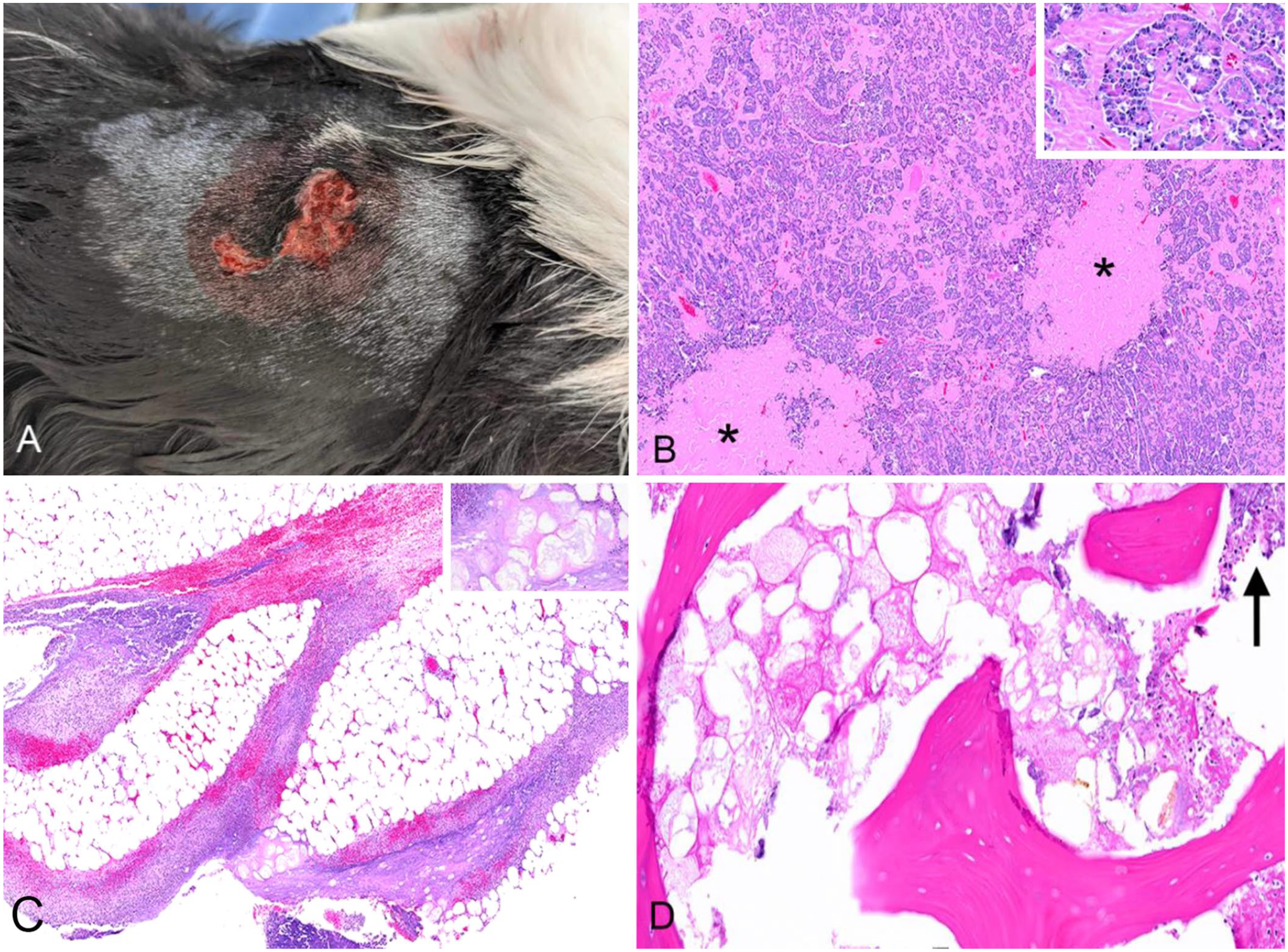 Histopathology of the pancreatic mass revealed pancreatic parenchyma compressed by a multilobular, moderately cellular, partially encapsulated neoplasm composed of polygonal cells arranged in acini and tubules and supported by a moderate amount of fibrovascular stroma that was markedly expanded by lakes of amorphous hyaline material (not highlighted with Congo red staining; Fig. 1B). Extensive areas of necrosis encompassed ~50% of the examined neoplasm and multifocally extended into the surrounding peripancreatic adipose tissue. Histopathology confirmed coalescing-to-extensive necrosuppurative panniculitis and myofasciitis of the left pelvic limb (Fig. 1C), necrosuppurative arthritis of the left carpal and left stifle joints, and necrosuppurative osteomyelitis of the left femur with bone marrow fat necrosis (Fig. 1D). The final diagnosis was a hyalinizing pancreatic adenocarcinoma with attendant inflammation, secondary panniculitis, polyarthritis, and osteomyelitis.