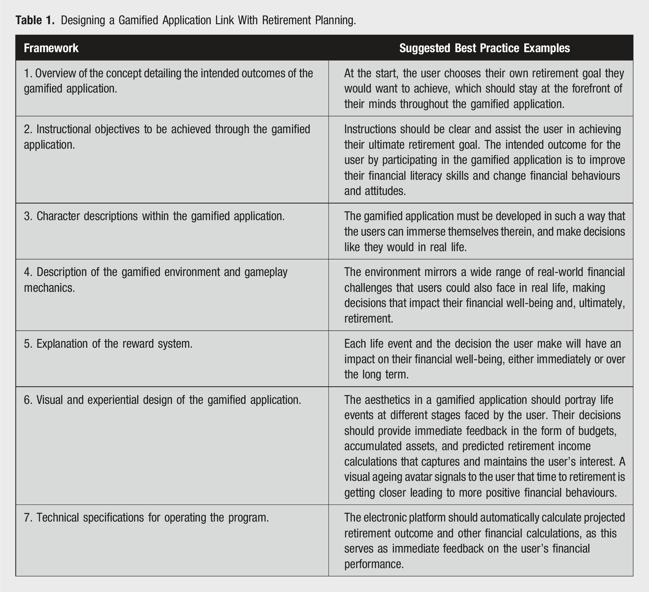 A basic framework when designing a gamified application suggested by Kapp (2012) can be linked to retirement planning as follows: