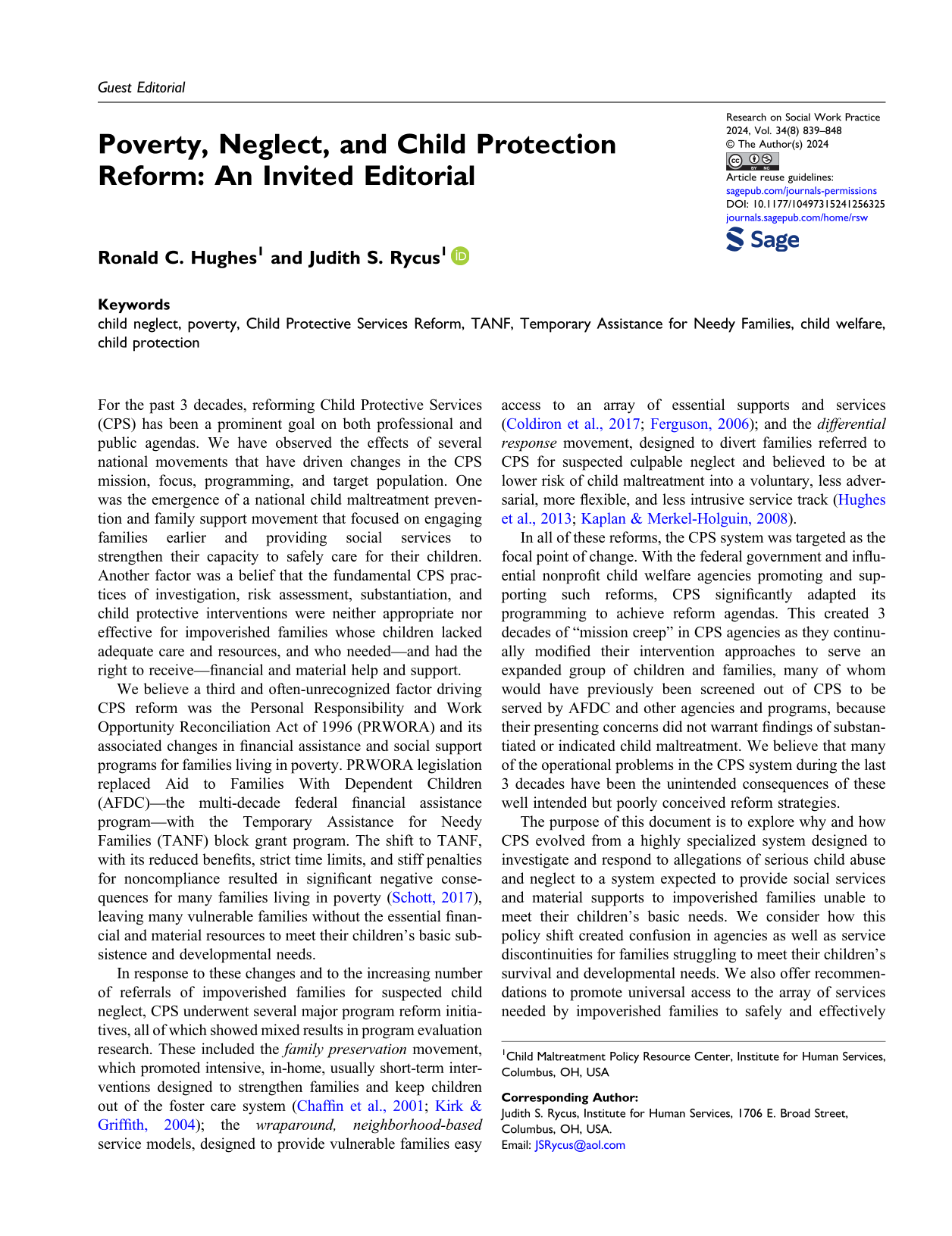 For the past 3 decades, reforming Child Protective Services (CPS) has been a prominent goal on both professional and public agendas. We have observed the effects of several national movements that have driven changes in the CPS mission, focus, programming, and target population. One was the emergence of a national child maltreatment prevention and family support movement that focused on engaging families earlier and providing social services to strengthen their capacity to safely care for their children. Another factor was a belief that the fundamental CPS practices of investigation, risk assessment, substantiation, and child protective interventions were neither appropriate nor effective for impoverished families whose children lacked adequate care and resources, and who needed—and had the right to receive—financial and material help and support.