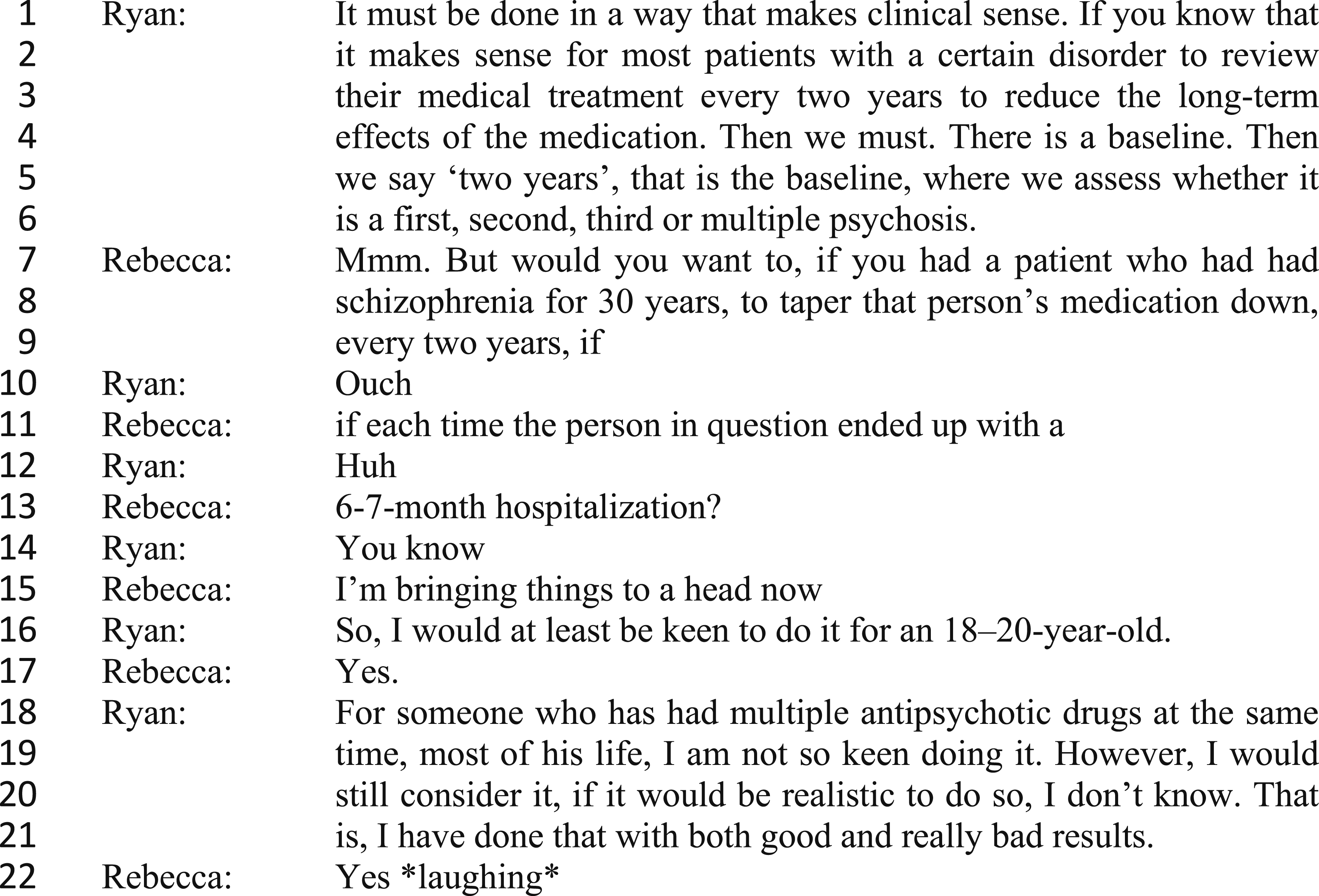 These reservations were discussed in one focus group in relation to the claim “Tapering of medication must be attempted at least every two years.” Rebecca and Ryan were from in- and outpatient mental healthcare services in Region B. Leading up to the extract presented in Figure 2, Rebecca argued that tapering should be evaluated according to the individual patient’s medical history. Extract 2.