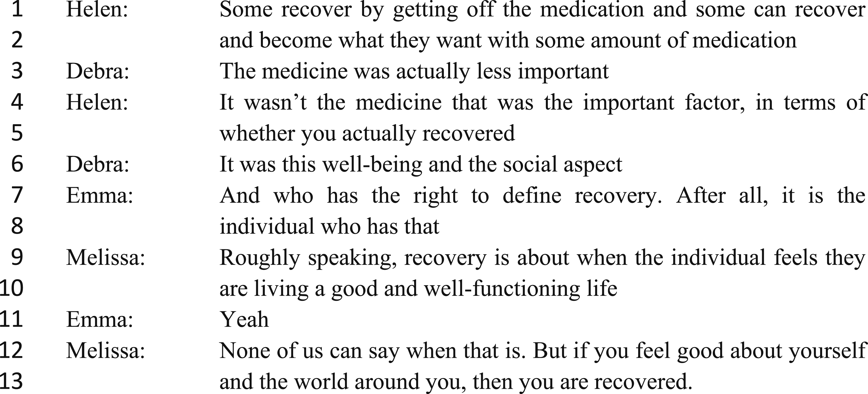 In the beginning of the extract, Helen argues that recovery does not equal clinical recovery. Debra argues that the earlier dominant focus on medication has been minimized with the implementation of recovery-oriented practices (line 3). In lines 4–5, Helen ascertains that in contemporary recovery-oriented practice, medical treatment is no longer considered central to secure recovery from mental illness, to which Debra adds that the central determinants for recovery have been occupied by quality of life and social functioning (line 6). Appealing to principles of patients’ right to self-determination, Emma employs a rhetorical question to justify the viewpoint that it is up to each patient to define recovery (lines 7–8). In the same vein, Melissa appeals to the principle of patients as experts in their own health (lines 9–10 and 12–13) to justify that staff have no right to define what recovery entails for individual patients. Their arguments therefore indicate that practicing according to contemporary recovery-oriented practices requires staff to view patients as equal experts and include patients’ preferences in treatment-related decision-making.