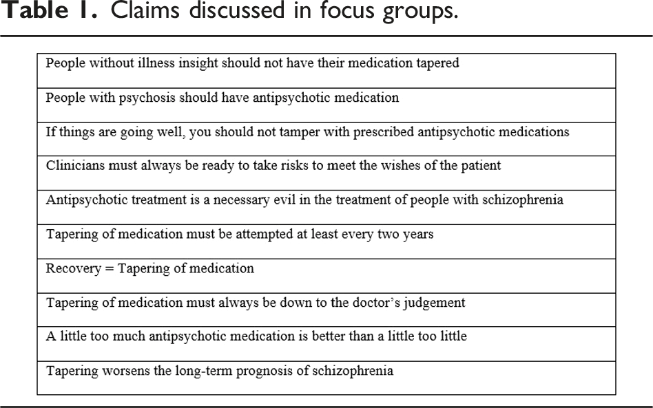 Focus group discussions were a fruitful approach to generate data on mental health staff’s perspectives on tapering of antipsychotic medication for people with schizophrenia. The interventionistic and confrontative nature of the activity-oriented focus group discussions combined with a low degree of moderator involvement added to create informal and relatively free-flowing responses compared to answers given during a structured interview. This, in turn, created valuable variation in the accounts applied by the participants. Based on the findings of our study, we cannot know how health staff might act in practice. Thus, this study would be usefully extended by ethnographic studies on mental health staff’s actions in mental healthcare practice to determine whether the identified positions reflect observable actions. The application of theoretical perspectives made it possible for us to take a reflexive stance toward our taken-for-granted assumptions and provide a focus for analysis beyond an everyday perspective (M. Jørgensen & Phillips, 2002). However, we acknowledge that combining a variety of sources (e.g., focus groups, field notes from observations, and journal documents) may have contributed to a fuller exploration of the study objective and that our conclusions will therefore be preliminary.