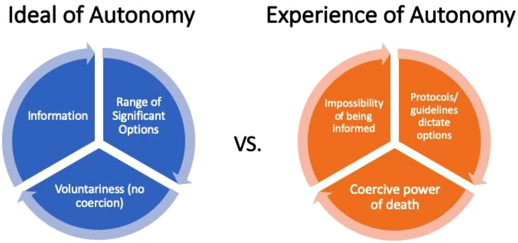 Beyond the process of candidacy, patients expressing that they had “no choice” but to pursue biomedical treatment is not limited to this study; indeed, researchers that have examined the experience of patients receiving cardiac devices such as implantable cardioverter-defibrillators and left ventricular assist devices have also found very similar results (Fowler et al., 2018; McIlvennan et al., 2014). In similar research regarding the decision-making process of patients with advanced HF who were offered a ventricular assist device, patients often felt they “had no choice” (p. 8) in the decision (Dillworth et al., 2019; Kitko et al., 2016; Ottenberg et al., 2014). Agency is constrained when patients construct consent to treatment as their only choice, as is the case in advanced HF. Researchers report that patients generally understand medical decision-making to be an emotional process of coming to terms with the recommended plan of care, often requiring intensive support from family members or a spiritual community, and that for some, “the desire to live supersedes reflective processing” that should accompany an autonomous decision (McIlvennan et al., 2014, p. 374). Considering that reflective endorsement of authentic desires is a requirement of autonomy (Mackenzie, 2008), it becomes clear how chronically ill patients may not always be able to fulfill the conditions required to exercise individual autonomy the way it is currently constructed. Although ACP is branded as a means to understand patient desires and support voluntary choice and autonomous decision-making, when treatment decisions are consistently framed as life-or-death decisions to the patient and family, a continuous cycle of accepting treatment can occur (Higginbotham et al., 2021).