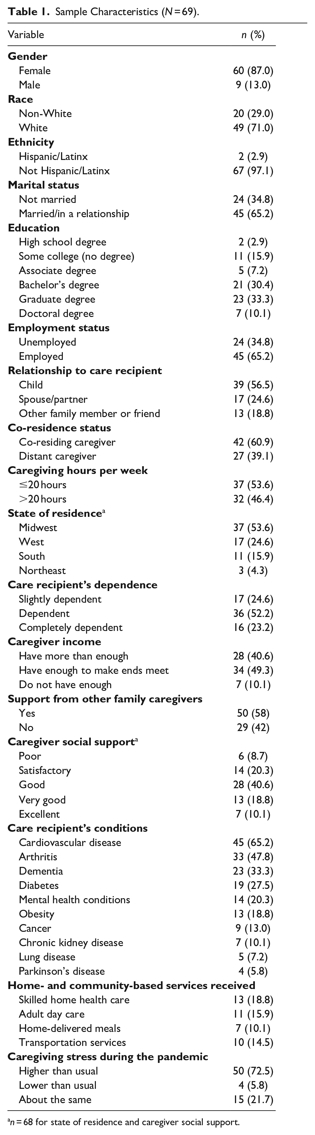 The majority of study participants were women (87%) and were on average 54.7 (±13.6) years old. Most of them self-identified as White (71%) and had a college degree (73.9%). Participants were residing in 23 states and about half of them lived in the midwestern United States. Half of our sample provided care to a parent, and two-thirds of the sample lived with the care recipient. On average, participants reported being a family caregiver for 7.7 (±7.7) years. Twenty-nine participants (42%) indicated that they were the only person assisting their loved one with their care needs. The remaining participants (