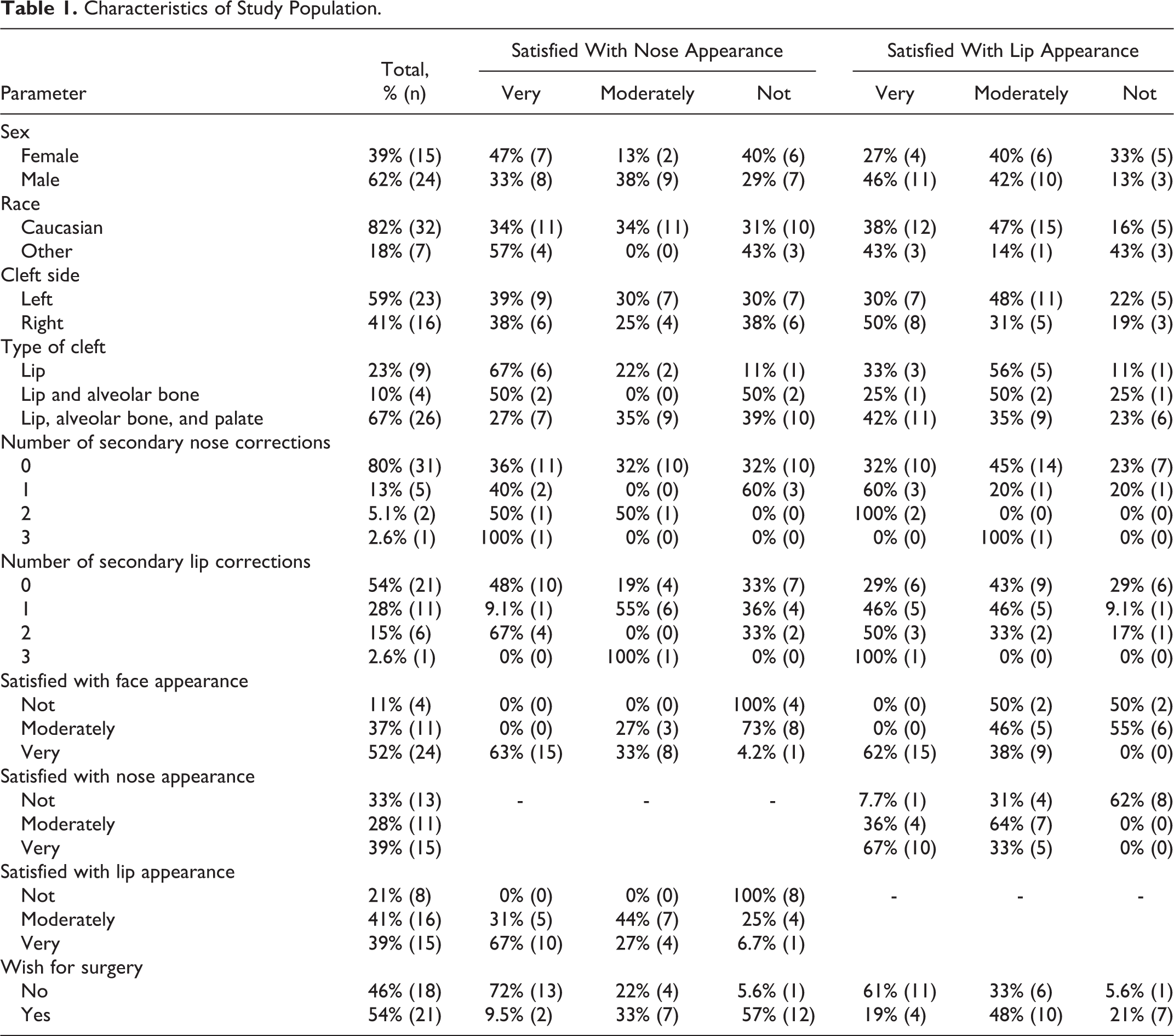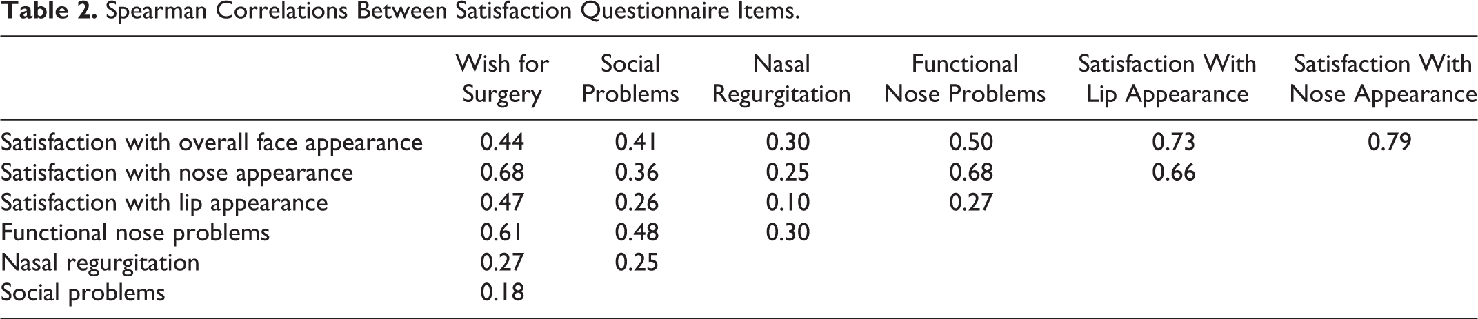 Patients who were very satisfied with their nose appearance were also very satisfied with their overall face appearance (strong correlation, ρ = 0.79) and lip appearance (moderate correlation, ρ = 0.66). Similarly, satisfaction with lip appearance was strongly correlated to overall face appearance (ρ = 0.73). All patients dissatisfied with their lip appearance were dissatisfied with the appearance of their nose as well (Table 1).