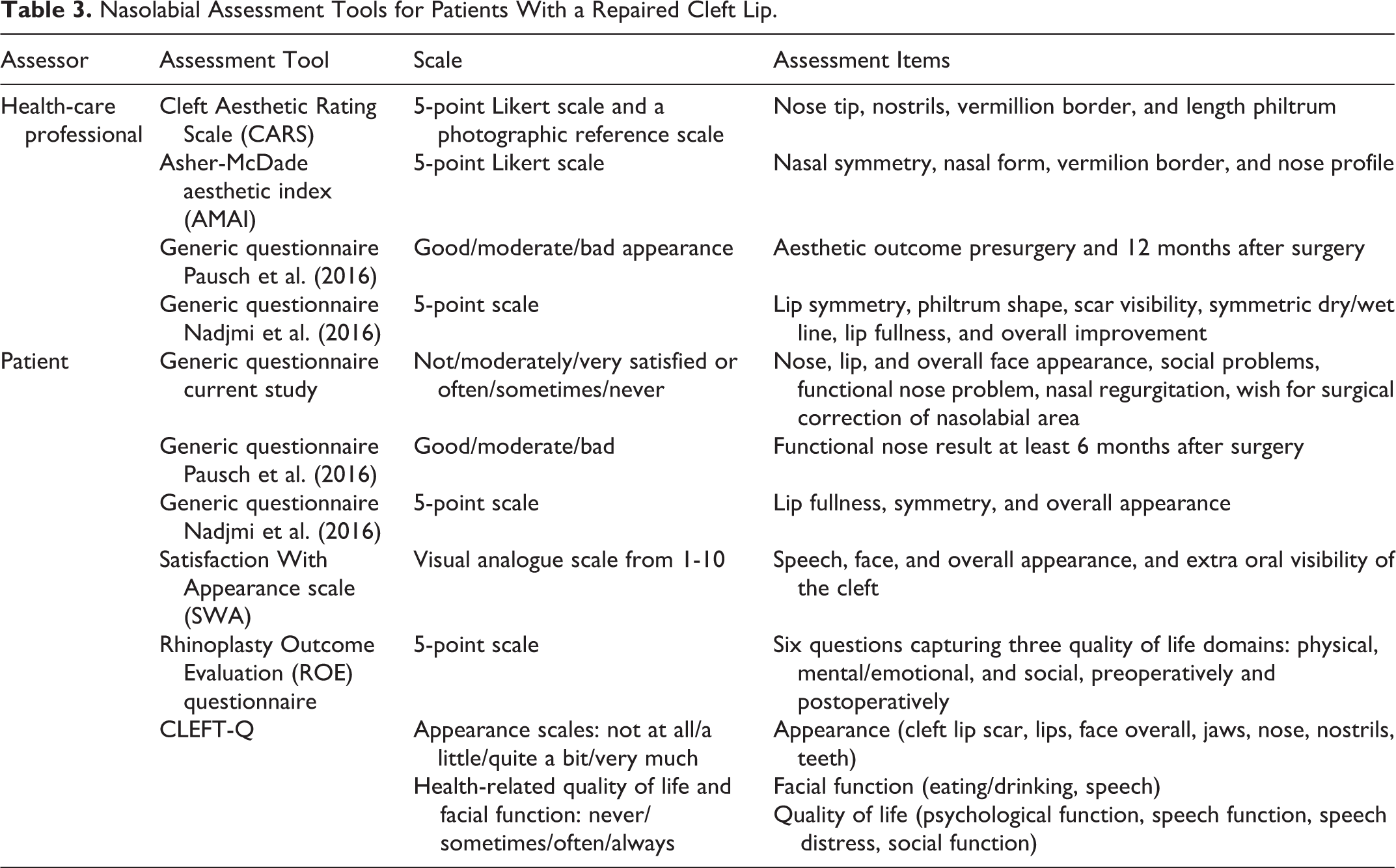 Our results are in concordance with Keijser et al. (2016), who reported a negligible correlation (ρ < 0.20 for all variables) between nasal appearance evaluation by a professional panel using the Asher-McDade aesthetic index (AMAI) and self-assessment of nasal appearance by patients (mean age 32 years) using the Satisfaction With Appearance scale (SWA; Asher-McDade et al., 1991; Alsarraf et al., 2001). The AMAI evaluates 4 parameters of the nose and lip on a 5-point Likert scale of which a mean score is calculated. A recent systematic review about PROMs among CL±P children showed that aesthetic considerations are most commonly analysed using the SWA, reflecting satisfaction with cleft-related and noncleft-related aspects of speech, face, and overall appearance, and extra oral visibility of the cleft on a visual analogue scale from 1 to 10 (Ranganathan et al., 2015). Mani et al. (2010), however, found a weak-to-moderate correlation (ρ = 0.48-0.53 for all parameters) between these assessment methods in a similar patient group, suggesting that other factors than the nasolabial appearance itself contribute to the self-assessment of patients with cleft, emphasizing the importance of clear communication between health-care professionals and patients to optimize satisfaction with treatment (Table 3).