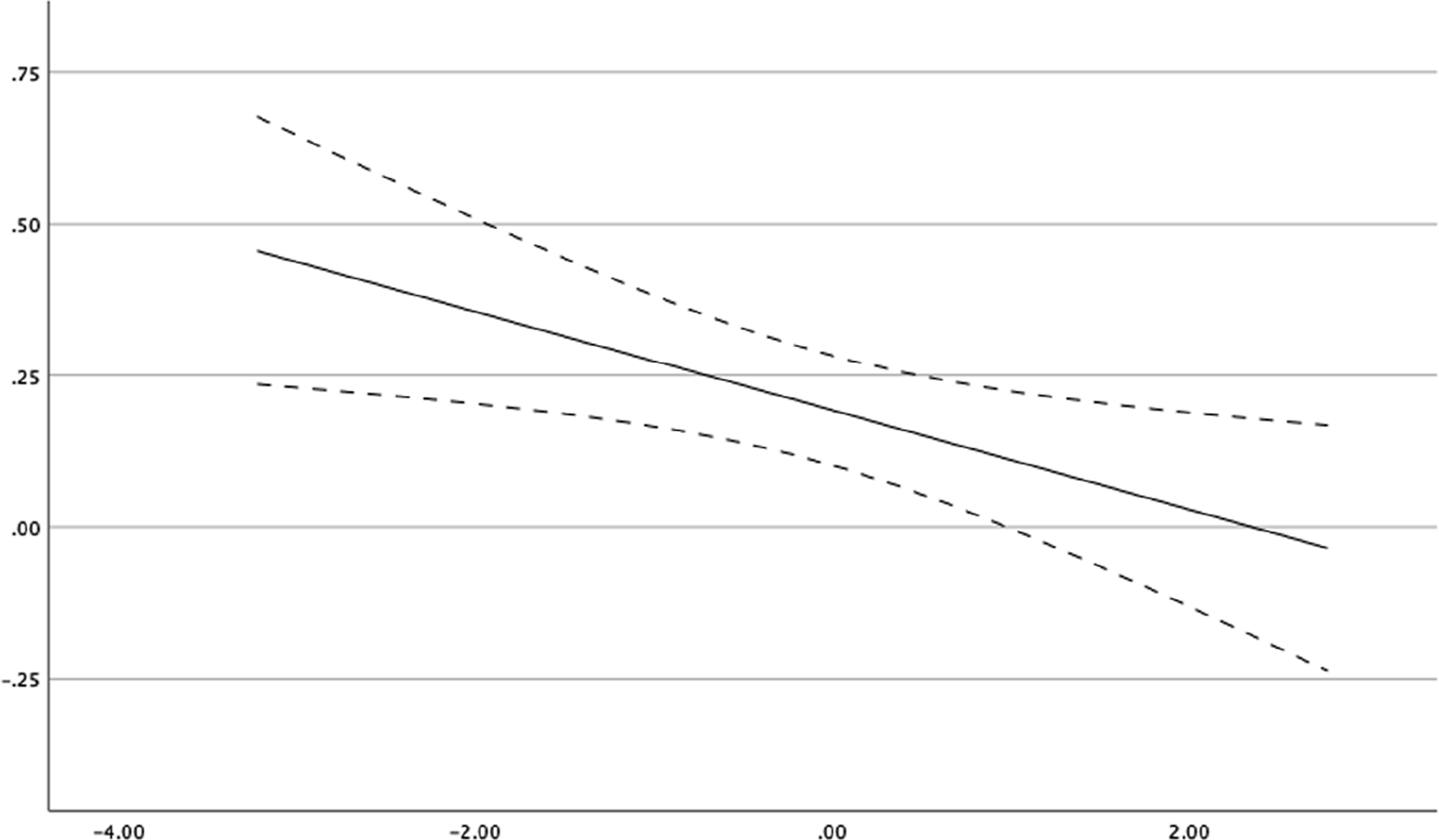 Finally, Hypothesis 6 assumed that metric quality would moderate the relationship between gamification elements and coworker competition. The findings suggest that metric quality moderates this relationship (B = −0.082 [−0.145; −0.018], Johnson-Neyman plot of interaction between awareness of gamification elements and metric quality on coworker competition.