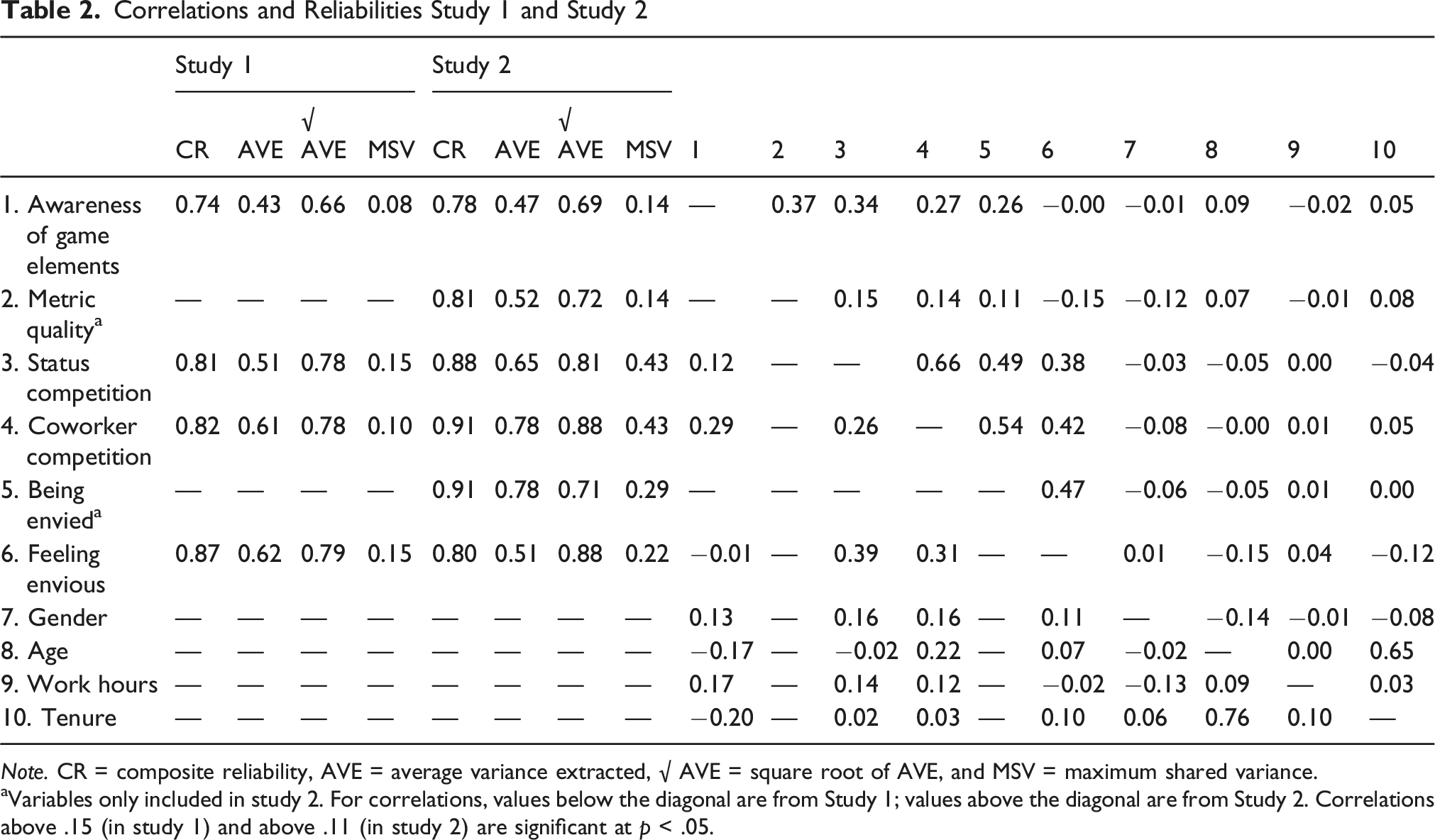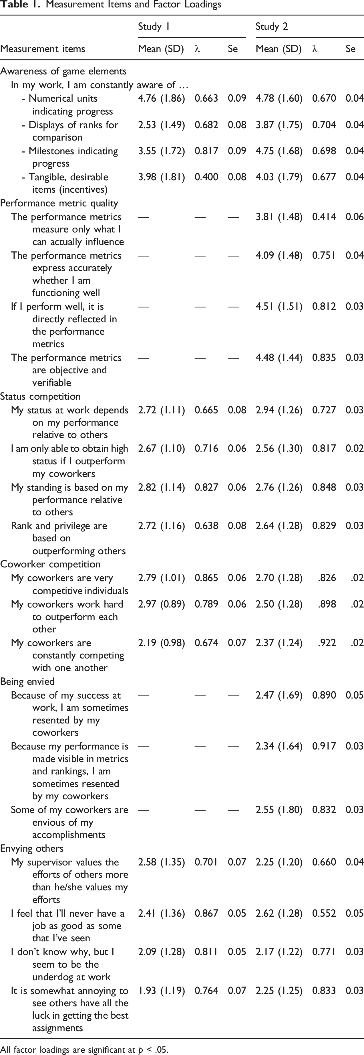 As indicated in Table 1, the measurement items for gamification elements, status competition, coworker competition, and envy, were identical to those used in Study 1.