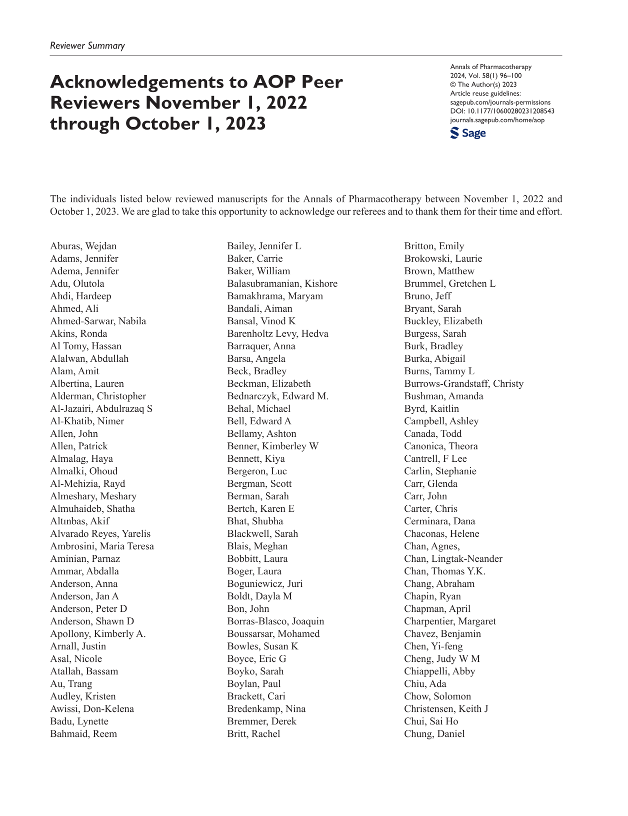 The individuals listed below reviewed manuscripts for the Annals of Pharmacotherapy between November 1, 2022 and October 1, 2023. We are glad to take this opportunity to acknowledge our referees and to thank them for their time and effort.