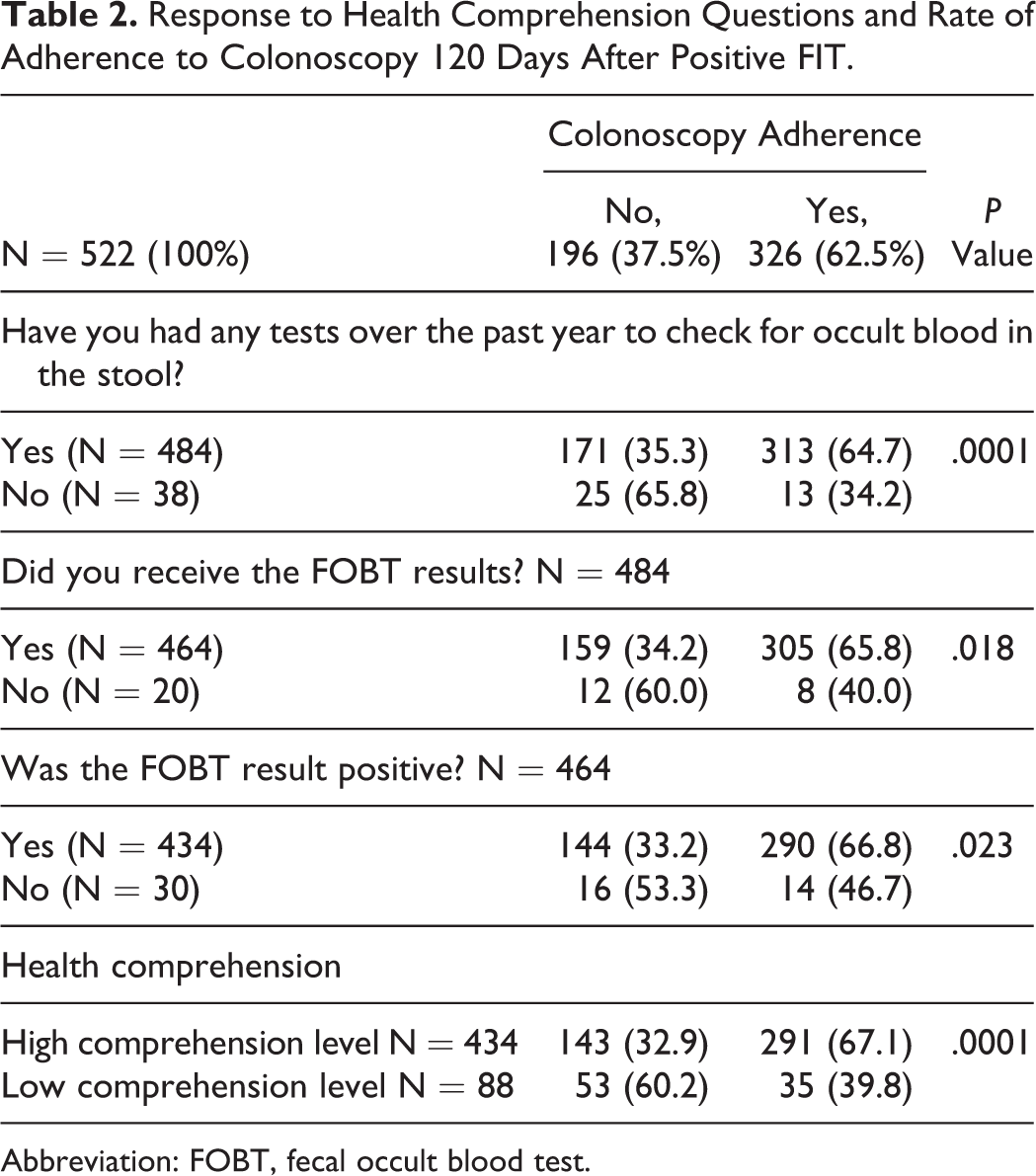 Response to Health Comprehension Questions and Rate of Adherence to Colonoscopy 120 Days After Positive FIT.