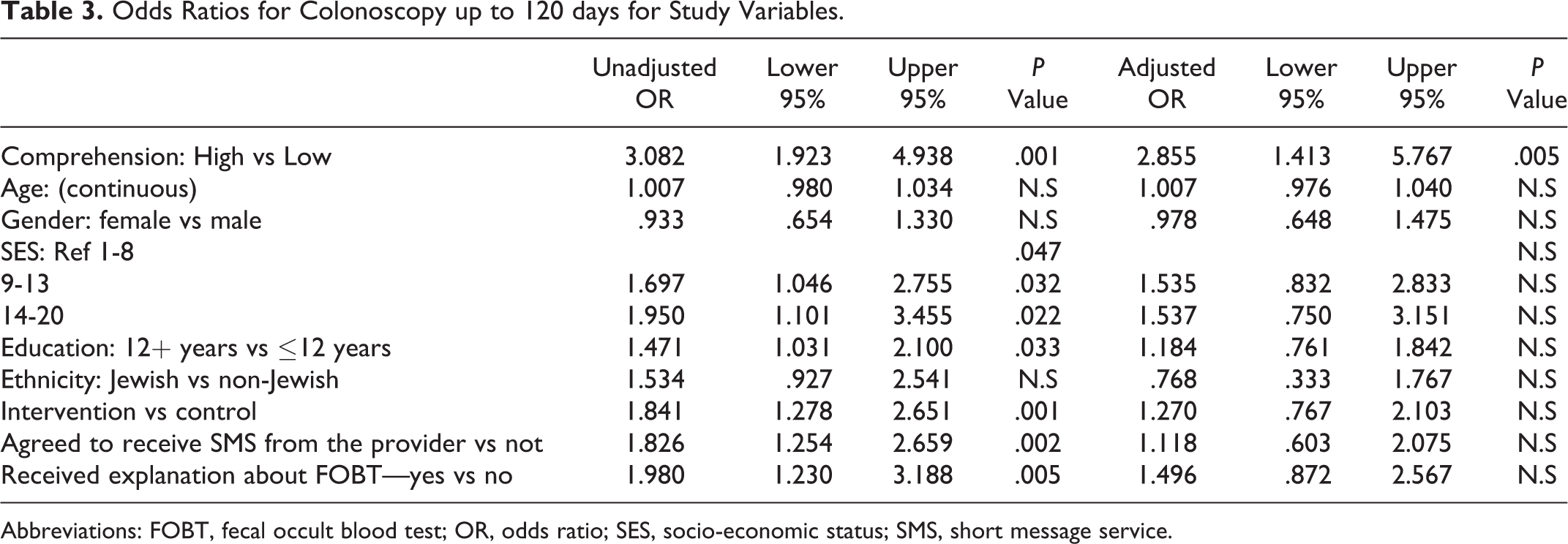 Comprehension and colonoscopy adherence were significantly associated. Adherence to colonoscopy was significantly higher among participants with high comprehension, after adjusting for gender, age, education, ethnicity, and socio-economic status.