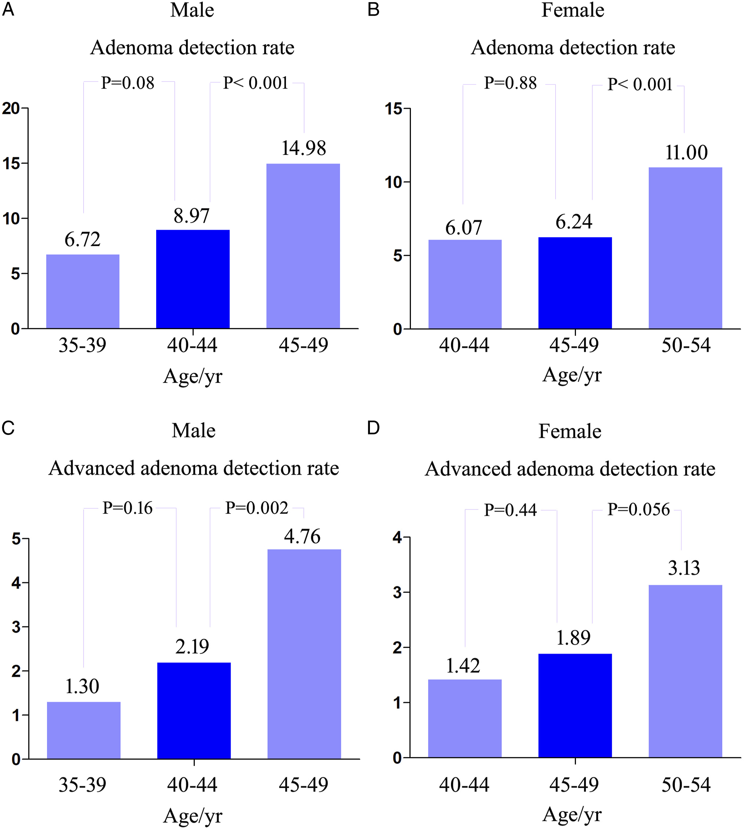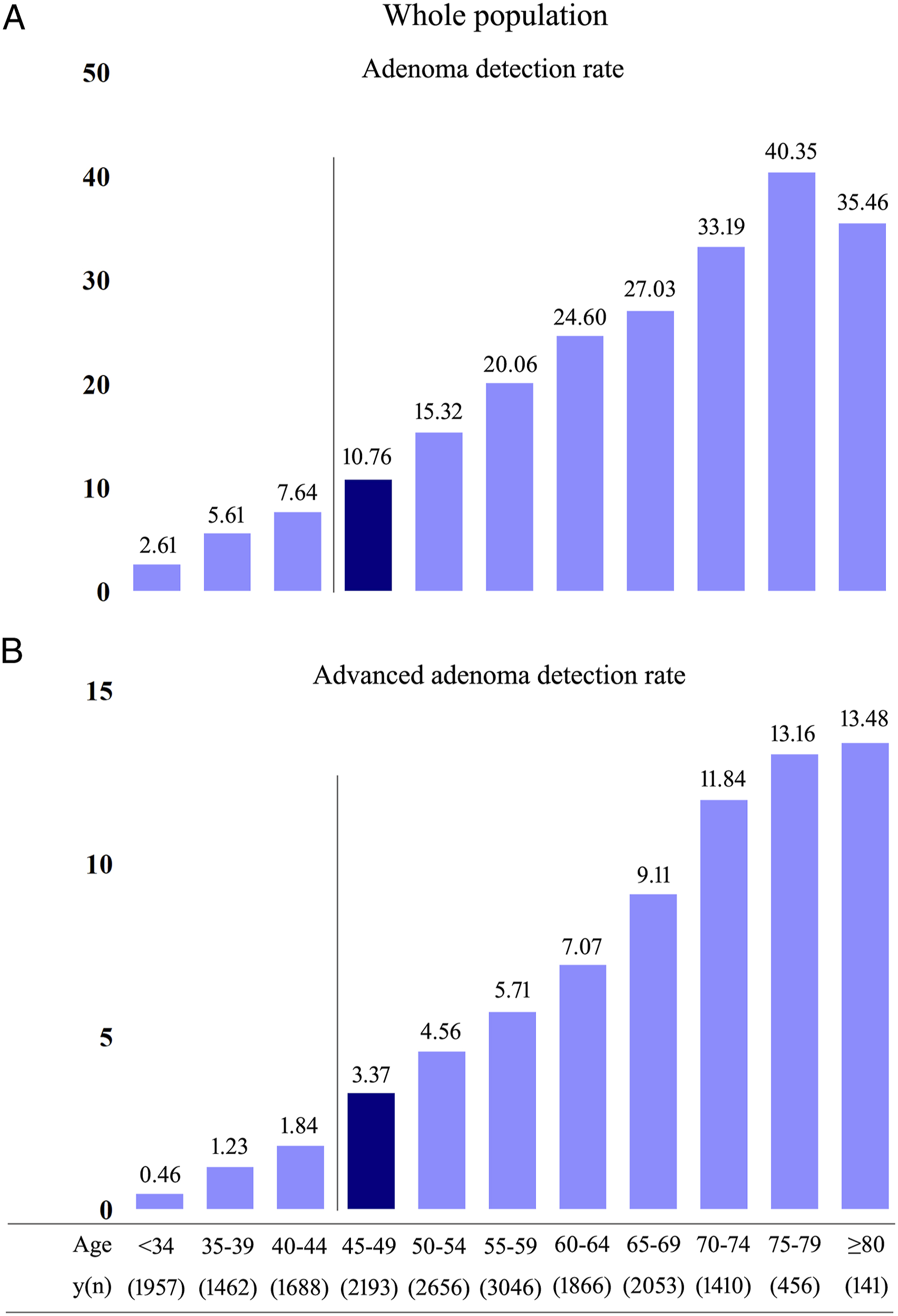 We included 18 928 patients with a median age of 54 years (range 15–90 years), including 10 143 men and 8785 women. The adenoma and advanced adenoma detection rates were 17.08% and 5.24%, respectively, and increased with age in the whole population. The adenoma detection rates increased from 8.97% (aged 40–44) to 14.98% (aged 45–49) and 6.24% (aged 45–49) to 11.00% (aged 50–54) in men and women (both