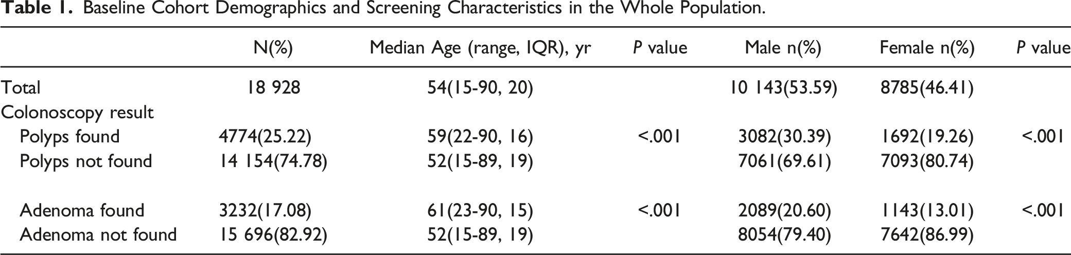 Of the 18 929 patients, polyps were detected in 4774 patients with a median age of 59 years (range 22–90, IQR 16). Polyps were not detected in the remaining 14 154 patients with a median age of 52 years (range 15–89, IQR 19). The polyp detection rate (PDR) was 25.22%. The age of the patients with polyps was significantly higher than that of those without polyps (