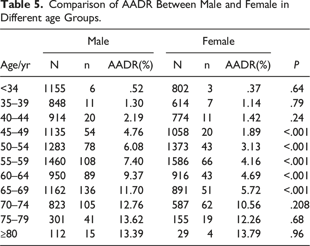 The AADR markedly increased from 2.19% to 4.76% between male patients aged 40–44 and 45–49 years (