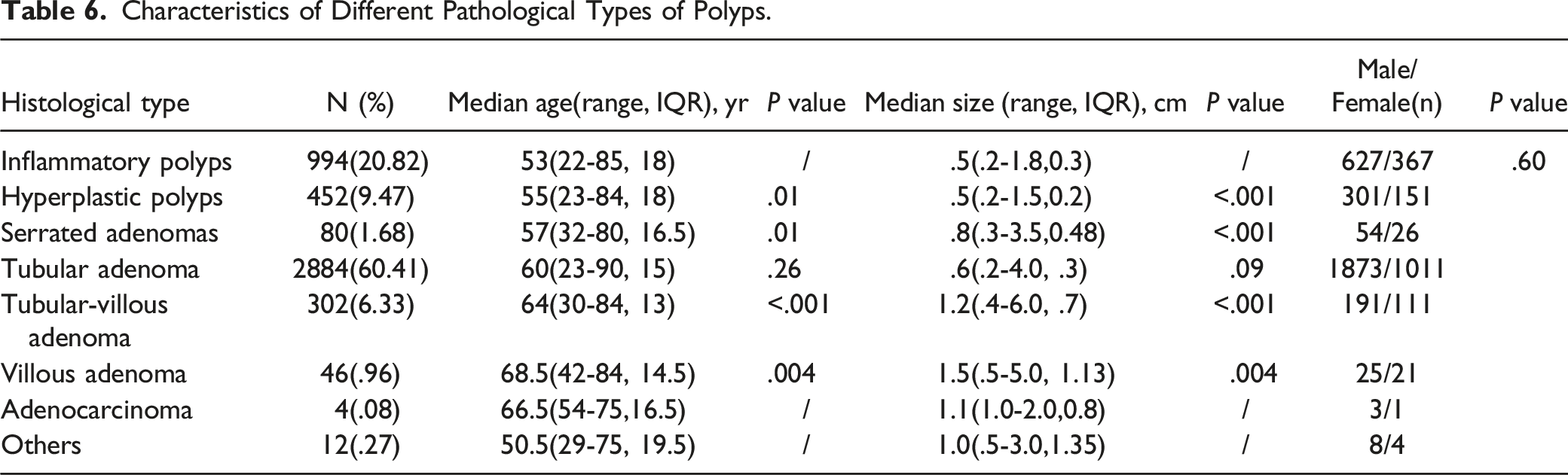 Characteristics of Different Pathological Types of Polyps.