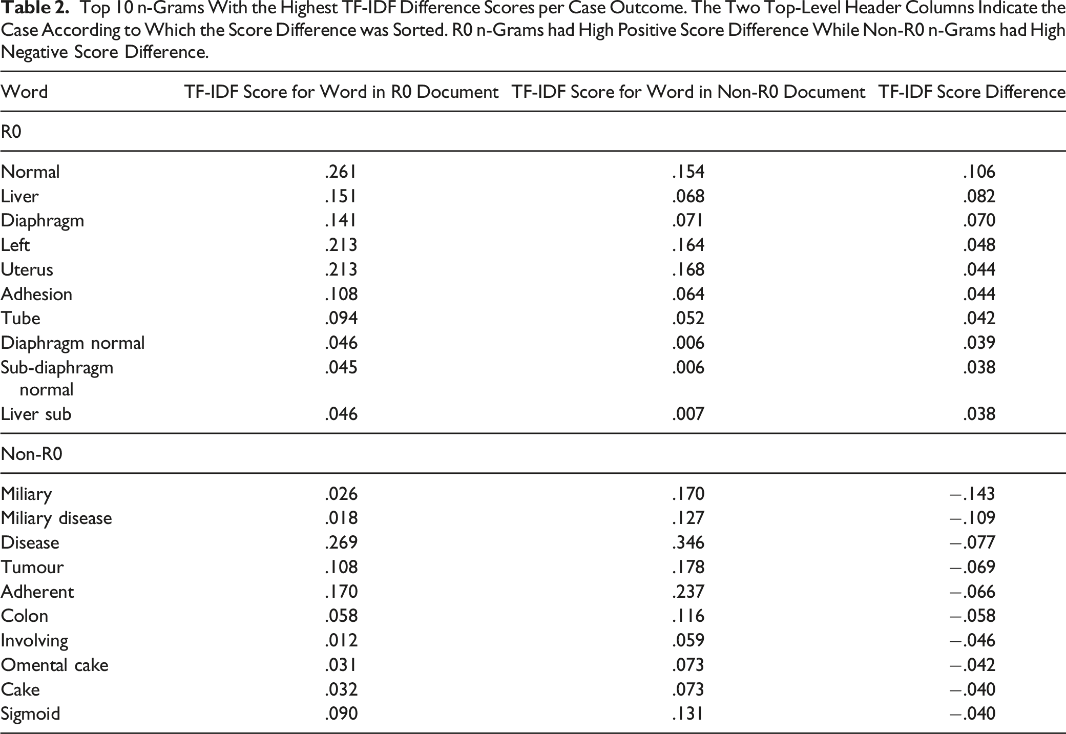 Top 10 n-Grams With the Highest TF-IDF Difference Scores per Case Outcome. The Two Top-Level Header Columns Indicate the Case According to Which the Score Difference was Sorted. R0 n-Grams had High Positive Score Difference While Non-R0 n-Grams had High Negative Score Difference.