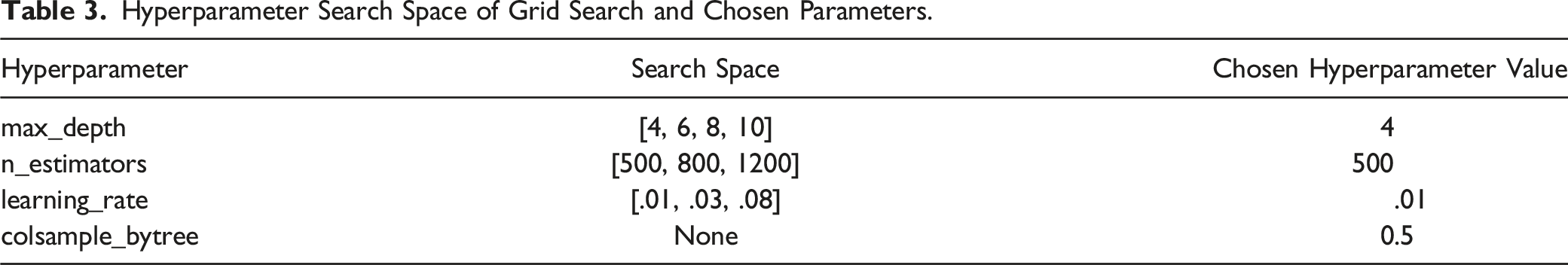 Hyperparameter Search Space of Grid Search and Chosen Parameters.