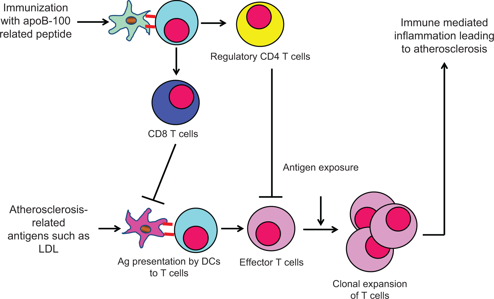 Upon encountering atherogenic antigens, the dendritic cells present such antigens to naive T cells with subsequent generation of effector T cells that eventually lead to inflammation in the arterial walls. Immunization with apoB-100 related peptide, especially p210, a subset of CD8+ T cells, are elicited and confer negative effect on dendritic cells to dampen atherogenic immune response. Regulatory CD4+ T cells can also be elicited and suppress effector T cells.