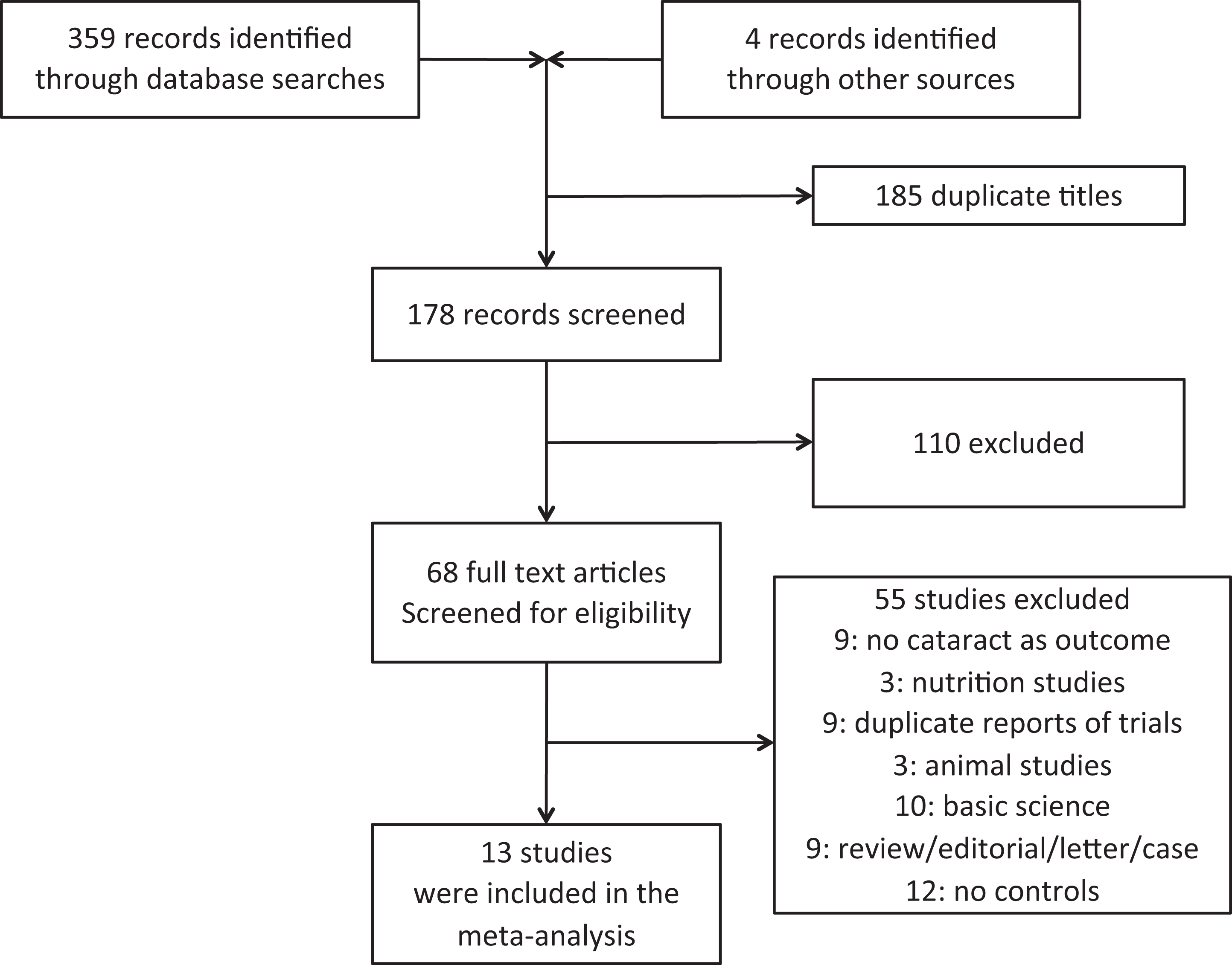 We performed a meta-analysis according to the Preferred Reporting Items for Systematic Reviews and Meta-Analyses guidelines. A systematic search of the MedLine, Web of Knowledge, Cochrane Database, and ClinicalTrials.gov was performed for the intersection of the terms “statins,” each of the marketed statins individually, and “cholesterol lowering medications” with “cataract” through the end of October 2012 (Supplemental Table 1; Figure 1). The searches were performed by the 2 investigators together while evaluation of the citations was done independently by each of the 2 investigators, and disagreements were reconciled at scheduled meetings. Studies were included if they were carried out on humans, had comparison groups, and had cataract as an outcome. Placebo or usual care was used as comparison group. Basic science studies, nutrition or animal studies, reviews, editorials/letters, case reports, and studies without comparison groups were excluded. Using the search strategy described in Supplemental Table 1, we identified 363 potentially appropriate titles for possible inclusion in the analysis (Figure 1). Of the 363 records retrieved (359 by the literature searches and 4 identified from other sources, that is, reading the references of reviews and the articles retrieved), we excluded 185 duplicate titles and screened 178 abstracts relevant to the analysis. Of the remaining 178 records,110 were excluded by reading the full-text articles. Of the remaining 68 records, 55 were excluded because they did not include cataract as an outcome, were basic science, animal or nutrition studies, duplicate reports from the same trial, reviews, editorials, letters, case reports, or they did not have a comparison group leaving 13 records for inclusion in the meta-analysis. 16 –28