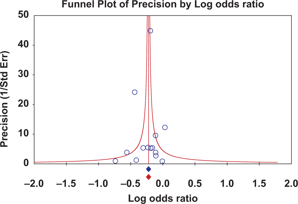To investigate whether 1 study biased the results, we performed the analysis 14 times removing 1 study at a time sequentially. The ORs ranged from 0.78, 95% CI 0.69-0.88,