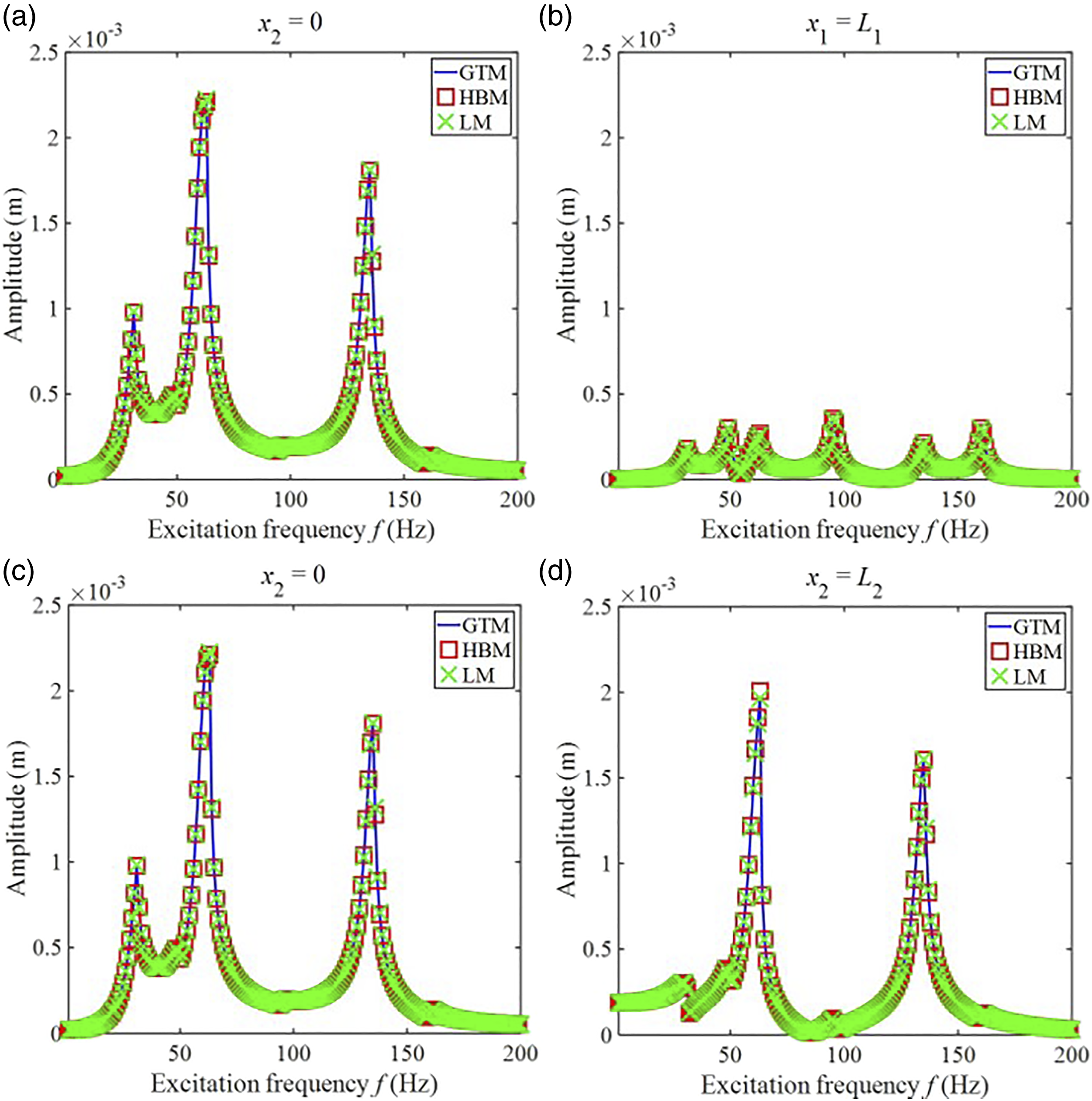 Figure 2 presents the amplitude–frequency responses of the double-beam system with nonlinear support predicted by the GTM, HBM, and LM. It should be noticed that the modeling method of the GTM and LM is quite different, where the GTM derives the residual equations from the governing equation of the double-beam system while the LM derives the matrix equation of the double-beam system from the Lagrange function. It is important to note that although the GTM and LM perform their analysis of the beam system’s amplitude–frequency responses in the time domain, the HBM performs its analysis in the frequency domain. Amplitude–frequency responses foreseen by the GTM, HBM, and LM resonate with each other well, where the max relative error of these methods is less than 5%. The above phenomenon verifies the correctness of GTM in predicting the dynamic responses of the double-beam system with nonlinear support. Amplitude-frequency responses predicted by the Galerkin truncation method, harmonic balance method, and Lagrange method (a)