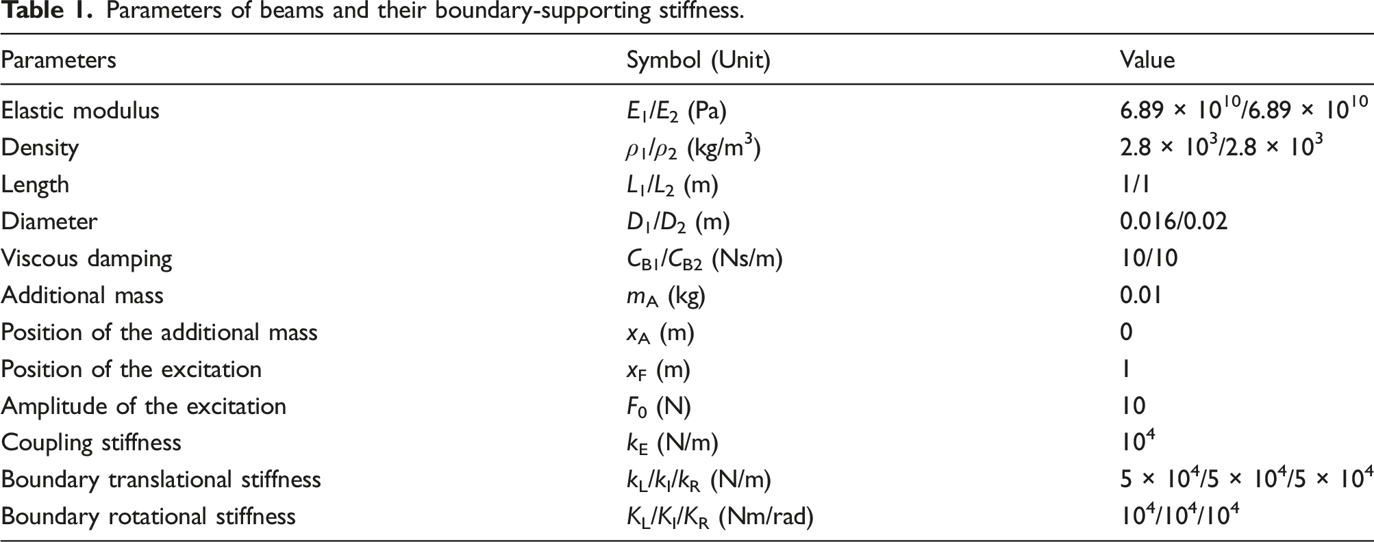 Parameters of beams and their boundary-supporting stiffness.
