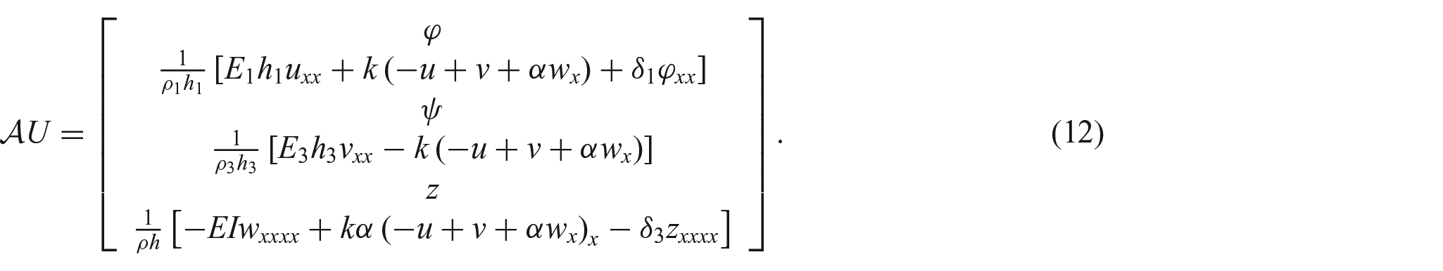 where , and are the longitudinal displacements of the centerlines of the outer layers and uniform transverse displacement of the whole composite. The positive constants , and are physical parameters representing, respectively, density, thickness, Young’s modulus, and moments of inertia of the layer for be the shear modulus of the middle layer. The new coefficients are , , and .