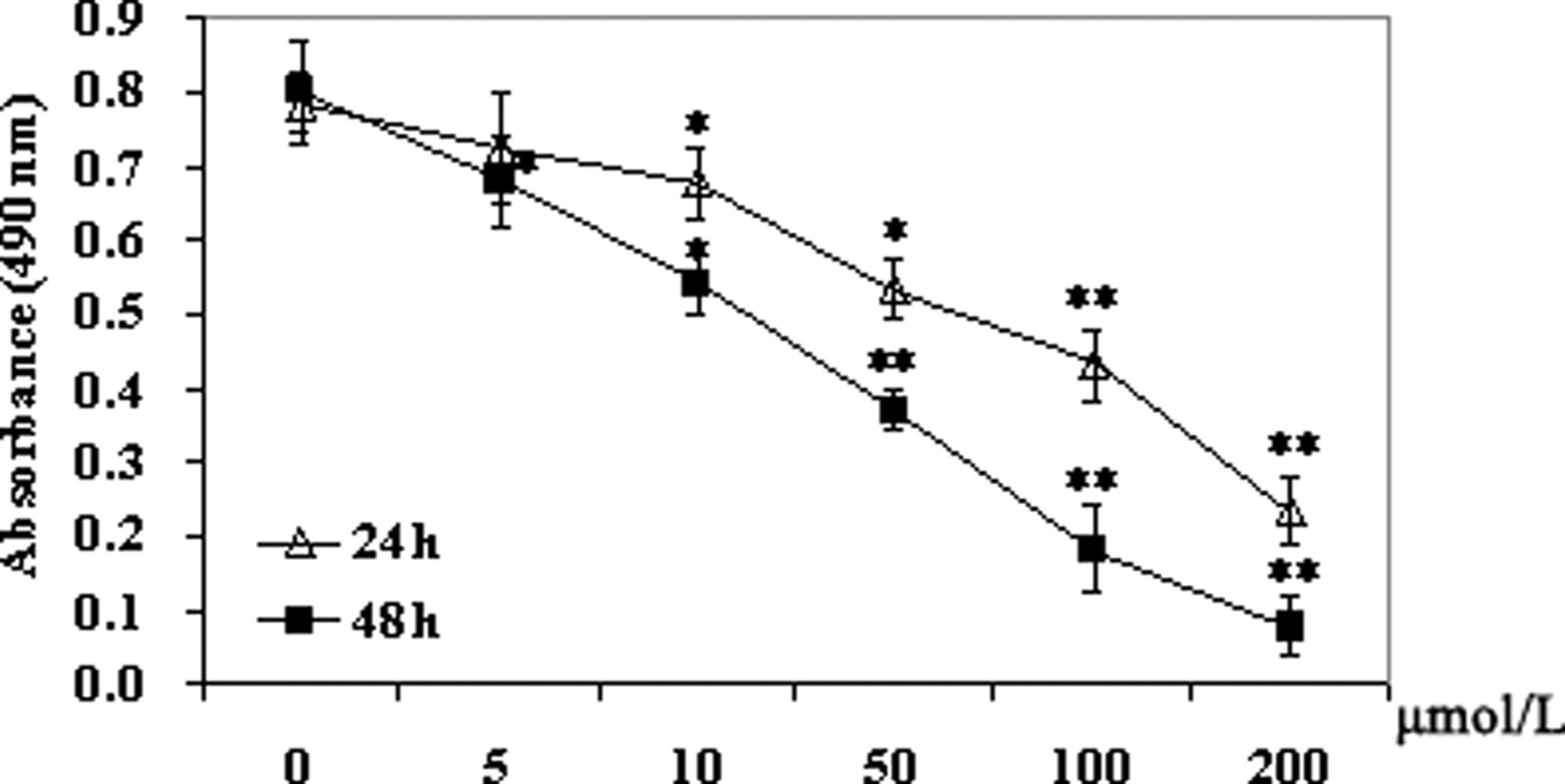 As expected, PFOS showed cytotoxic activity. In comparison with the control cells, N9 cells exposed to PFOS for 24 and 48 hours showed a significant dose-dependent inhibition of cell growth at a concentration of 10 μmol/L or higher (