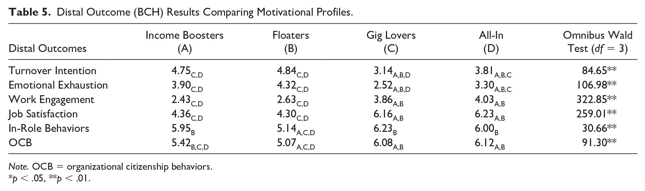 The study also found differences in work attitude, performance, and well-being outcomes (RQ3) by examining work engagement, job satisfaction, OCB, and in-role behaviors.