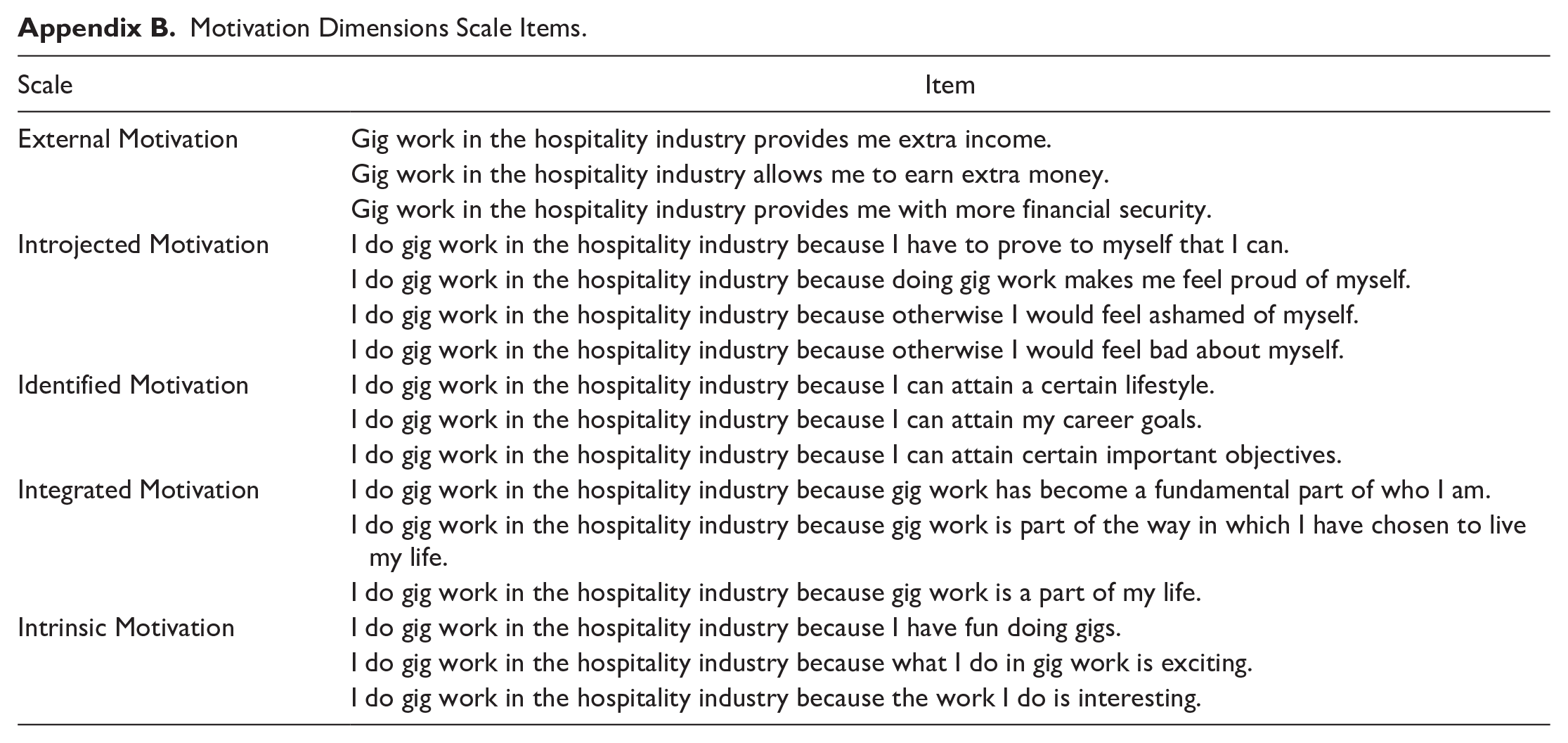 | Introjected Motivation | I do gig work in the hospitality industry because I have to prove to myself that I can. |