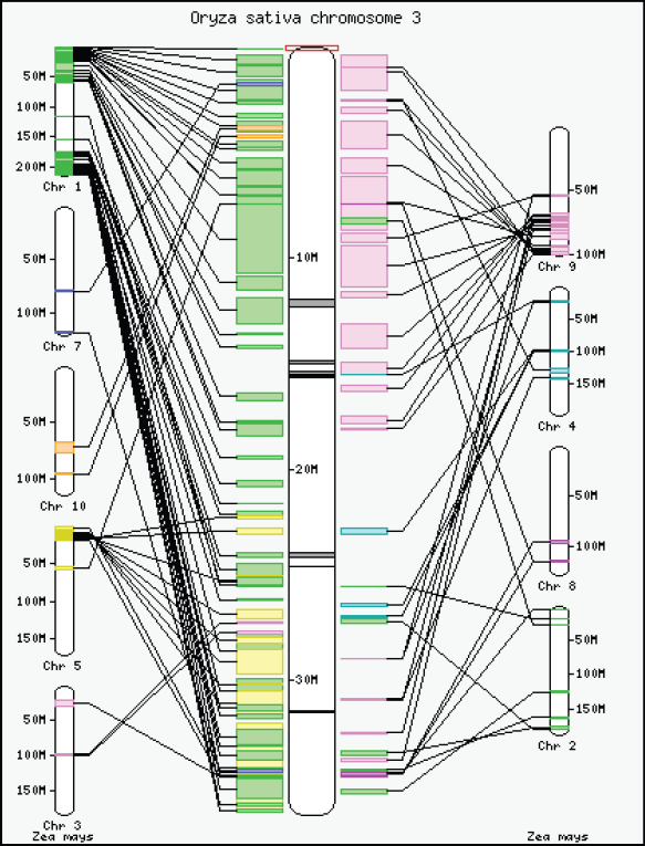The databank which has the most information on the syntenies among the cereal genomes is Gramene (Jaiswal et al. 2006). The current version at time of writing is release 21. From this we can obtain a conservative (i.e. confined to high homology regions only) estimate of duplicate blocks by comparison with the rice genome. For example, in Figure 1, we can visually identify large duplicated regions in chromosomes 1 and 9, chromosomes 1 and 5, and possibly a number of smaller ones, all by virtue of their common homology with regions of rice chromosome 3.