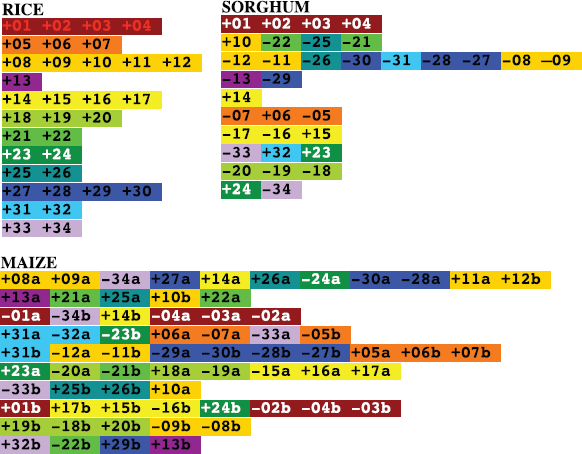 Order of syntenic blocks in rice, sorghum and, in two copies each, maize.