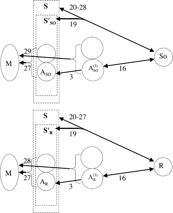 Results of search for ancestral tetraploid. M, R, SO = maize, rice, sorghum genomes. S = set of solutions to the genome halving problem. SR′, S′SO = subsets closest to R, SO, = genome on trajectory from AR ∊ SR′ to R. = genome on trajectory from ASO ∊ S′SO to SO.
