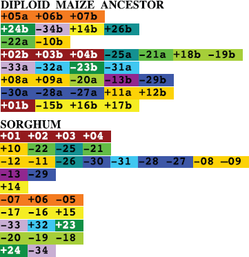 Unfortunately, there is as yet no comparison of syntenic blocks between sorghum and the other genomes on Gramene. However, there are extensive mapping data of various kinds of markers. We bolstered our preceding data collection by searching sets of duplicate markers in maize that had single copies in sorghum and rice, comparing mainly the Patterson, 2003, genetic map for sorghum, the IBM2 Neighbours, 2004 and Cornell Wilson, 1999, genetic maps for maize and the Annotated Nipponbare Sequence, 2006, sequence map for rice. All the markers satisfying these criteria fell into the rice-maize syntenies established previously. Based on these criteria, i.e. markers identified as homologous in Gramene, with a single copy in each of rice and sorghum and two copies in maize, plus the requirement that the maize and rice copies fall into the appropriate, previous identified, rice-maize syntenic blocks, we could now identify 34 syntenic blocks as basic data for our reconstruction. These data are depicted in Figure 2, but should be considered to constitute a working hypothesis; definitive data must await the finishing of the maize genome, the sequencing of the sorghum genome, and the further application of global alignment and synteny block construction methods.