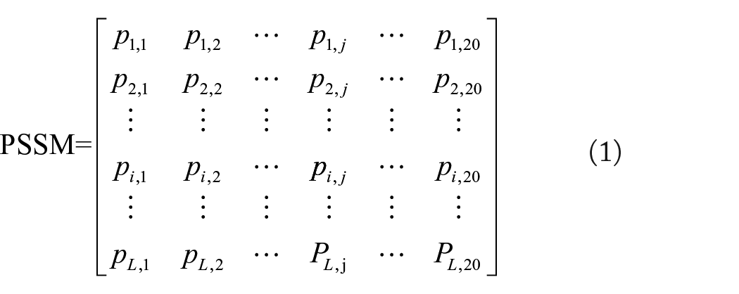 The PSSM is widely used in various biological research works, such as studies of subcellular localization, disordered regions, and protein secondary structure. The PSSM also has great potential in extracting evolutionary information from amino acid sequences. In this work, each protein sequence would be converted into PSSM by adopting a Position-Specific Iterated Basic Local Alignment Search Tool (PSI-BLAST). 24 The PSSM can be represented as follows: