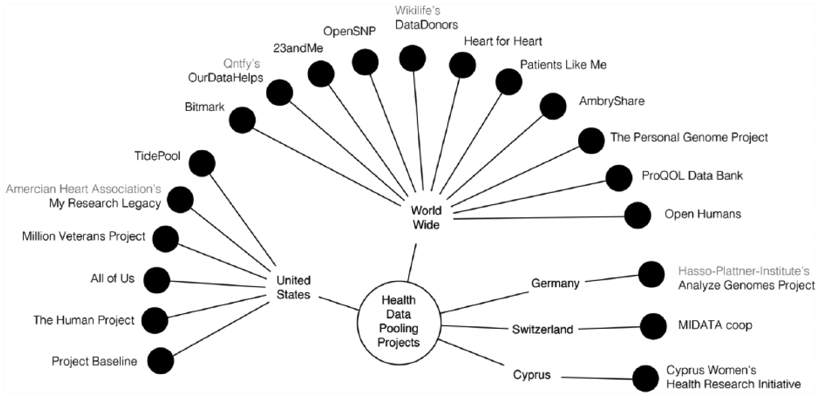 Analysis of the data from participant observation highlighted that data donation exists among an international ecosystem of health-related data sharing activities. This included data philanthropy, data collaboratives, data pooling, data markets, and data brokers. Figure 2 illustrates the network of data donation platforms documented from the observations of online discussions, informal conversations, and semi-structured interviews.