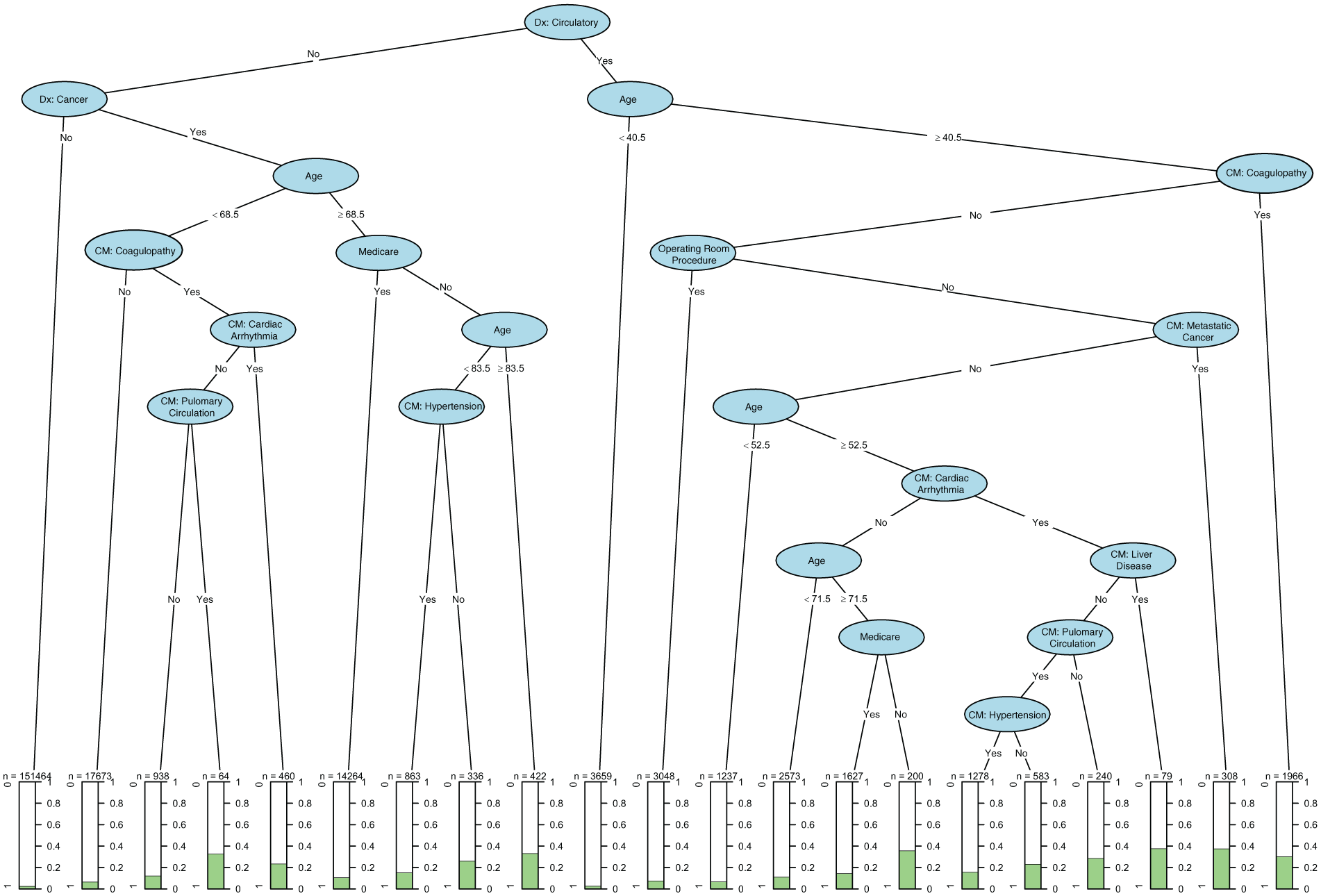 The random forest model identified several important variables not included in the individual tree, those being weight loss, congestive heart failure, and genitourinary conditions. The variable importance results reported in the random forest are the average results of many individual trees—many trees included the three omitted variables while others did not. Given that the CART tree represents an individual tree and sample; in this case sample, 789 out of 10 000, it is possible that variables identified in the random forest analysis are not represented in this specific tree. Omission of these variables in the individual tree can be due to the greedy splitting procedure that identifies the best split at that particular point in the tree without considering the impact on the full model. Therefore, depending on the random sample chosen to run the CART, the tree for each sample can include different variables and split points.