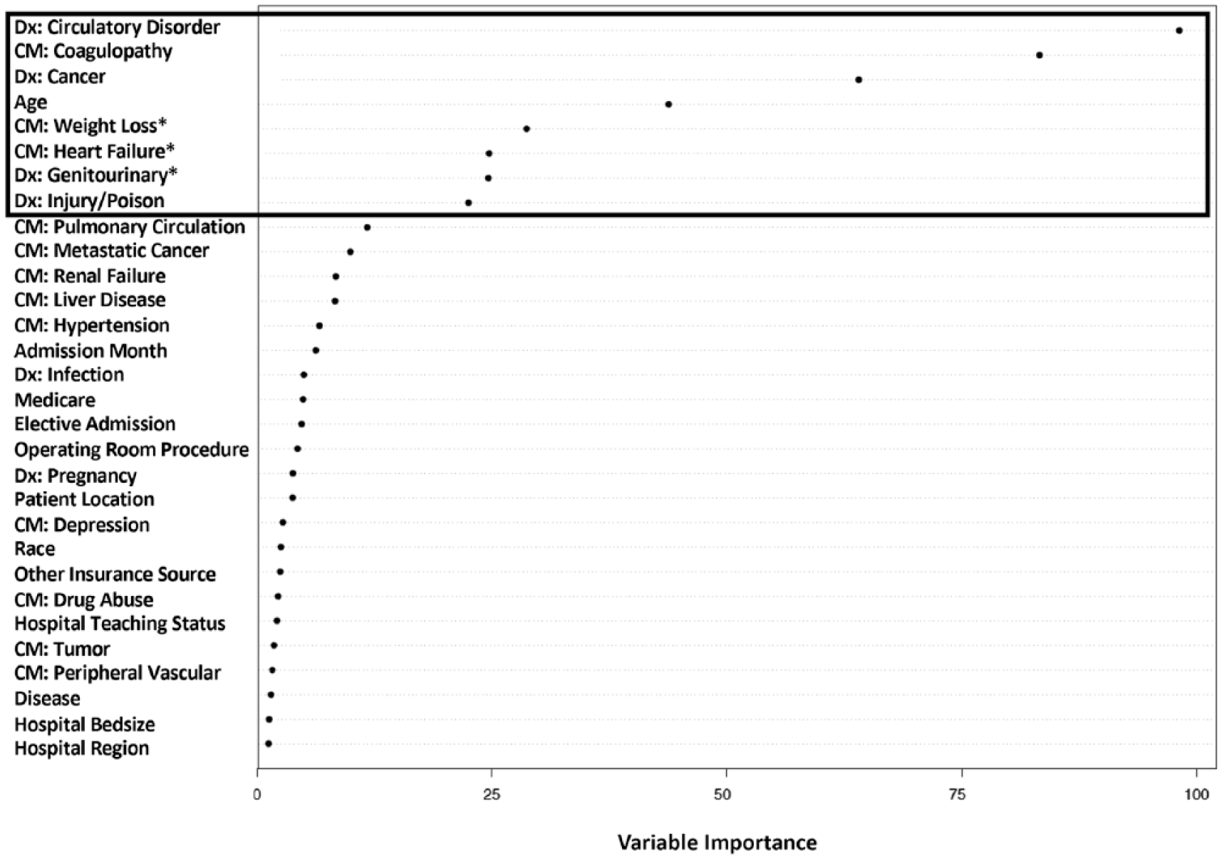The results from the random forest analysis are presented in Figure 2. Variables identified as being important via random forest, but not included in any of the CART pathways include weight loss, congestive heart failure, and genitourinary.