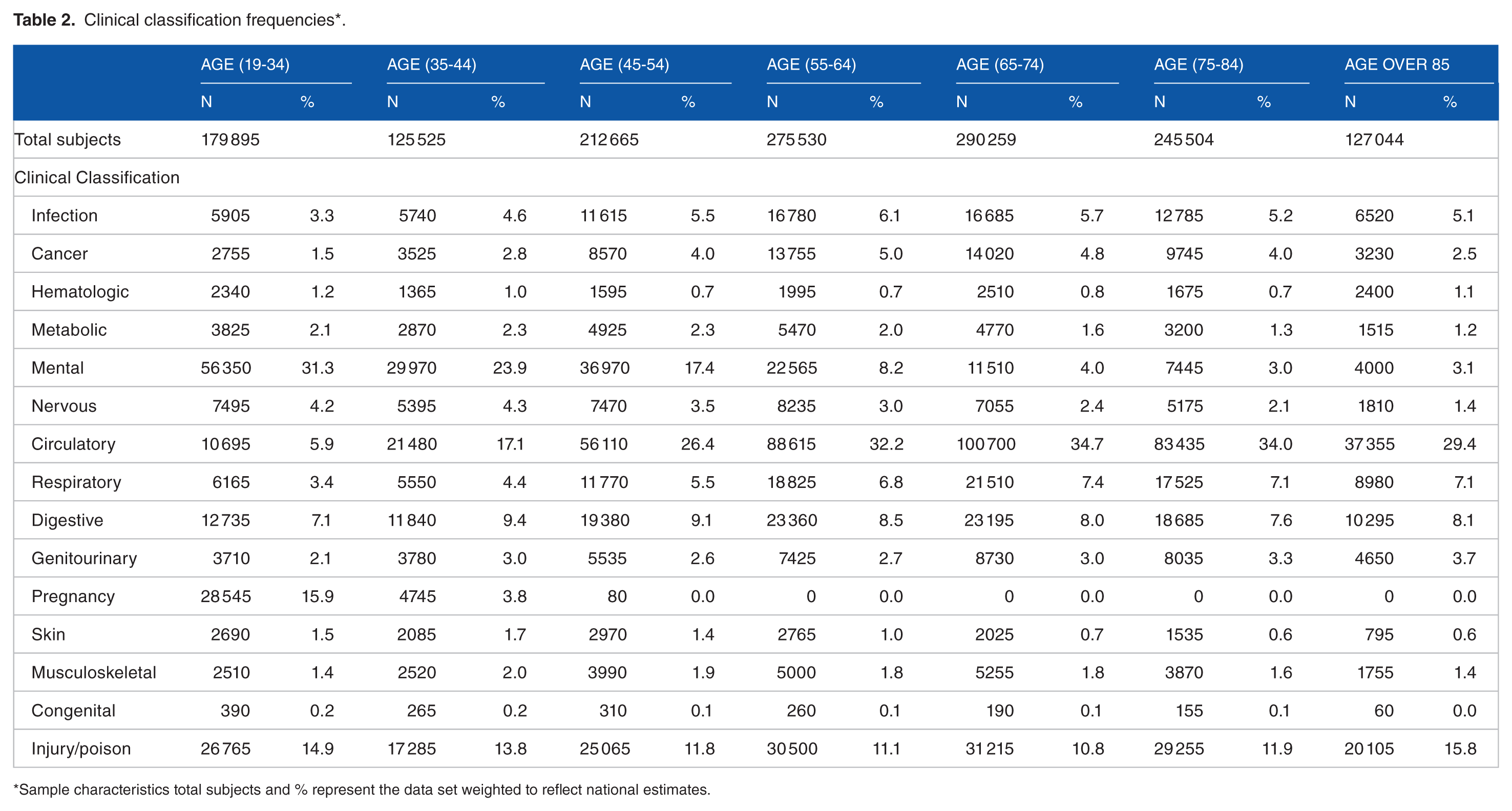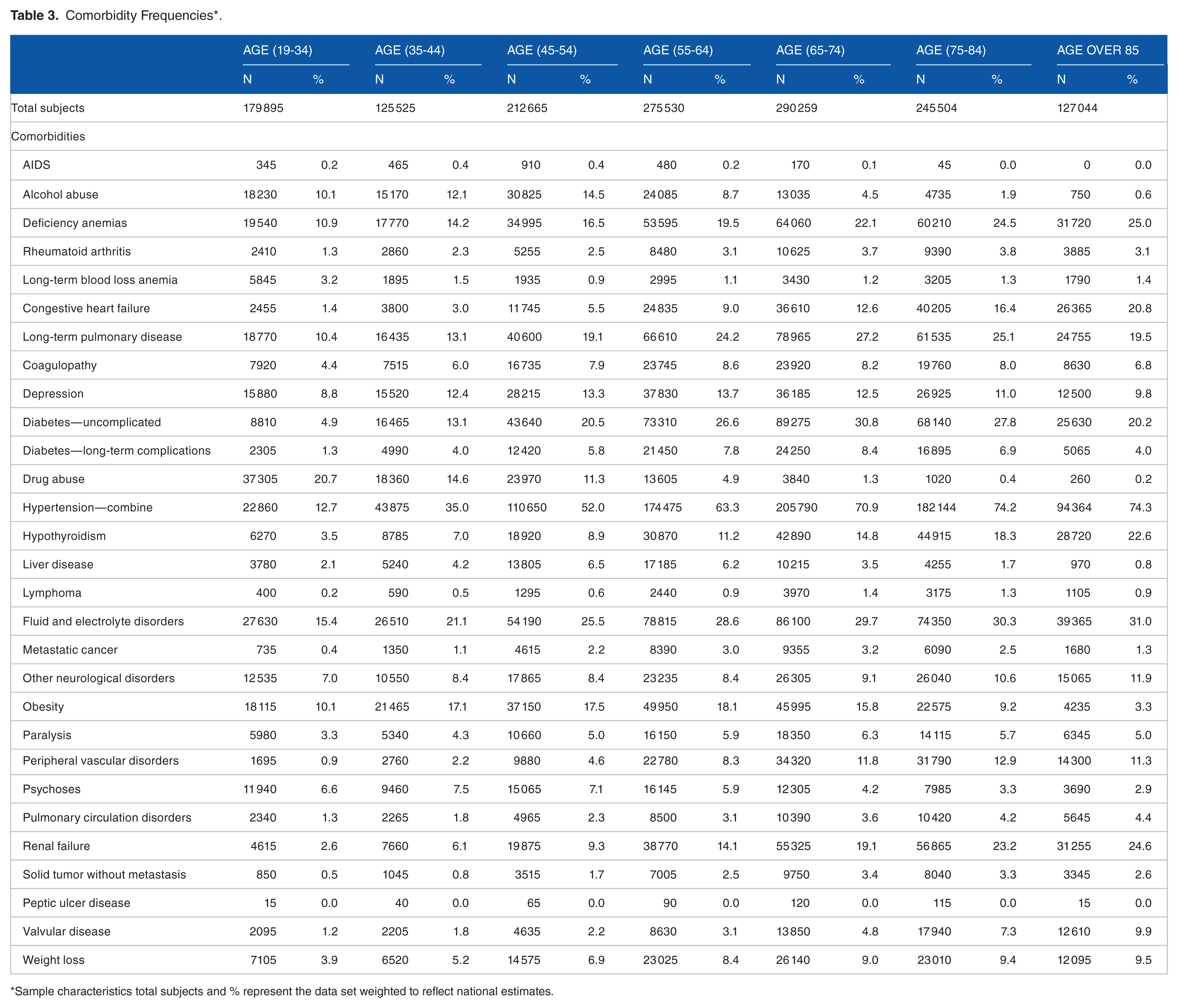 In 2013, approximately 1 456 422 adult patients underwent interhospital transfer, 52% were male, 66% White, 11% Black, and 7% Hispanic. The primary payers for the interhospital transfer were Medicare 44%, Medicaid 19%, and private insurance 26%. Further demographic characteristics of the nationally weighted sample are provided in Table 1, and the frequency of the primary diagnosis categorized by the multi-level diagnosis category of the CCS in Table 2. As expected, circulatory disease was the most frequent diagnosis in the older age groups (45 and older), whereas mental health was the most frequent in the youngest age groups (19-44). Frequency of comorbidities across age cohorts is presented in Table 3. The distribution of patient characteristics across the total study population and between the training and testing data sets are available in Supplementary Material Table 2.