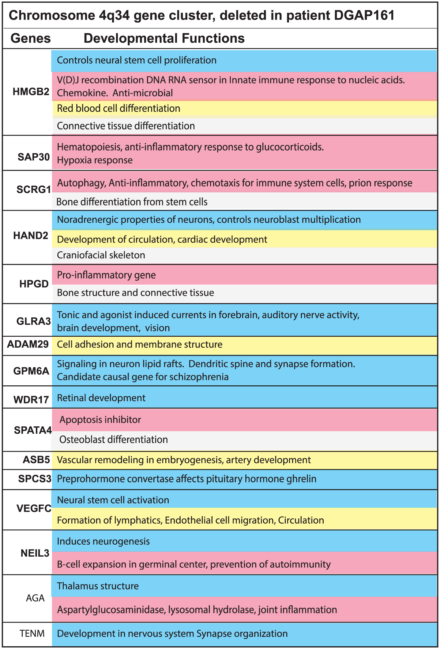 The nervous system has a close relationship to structures essential for immunity, circulation, cell barriers, and protective enclosures. Genes essential for all these functions must develop in concert so chromosome segments deleted in neurodevelopmental disorders may be critical for this coordination. Genes for these related functions are located close to each other on the same linear segment of a chromosome (Figure 1). For example, deletions at 4q34 in patient DGAP161 are shown in Figure 1. The genes within the 4q34 deletion in each of the 4 categories tested are color coded in Figure 1. Figure 1 is representative of 6 other chromosome bands that were also tested and gave similar results: 2q24.3, 6q13-6q14.1, 10p14-10p15.1, 13q14.2, 18p11.22-p11.32, and 19q12-q13.1. Deletion of these clustered arrangements has been correlated with serious neurodevelopmental disorders. 1 Alternatively spliced forms of the same gene may encode for pleiotropic functions that must be synchronized and coordinated among diverse cells. Multiple functions for the same gene in different cell types are commonly found. Hormonal signaling represents a major control mechanism. 13