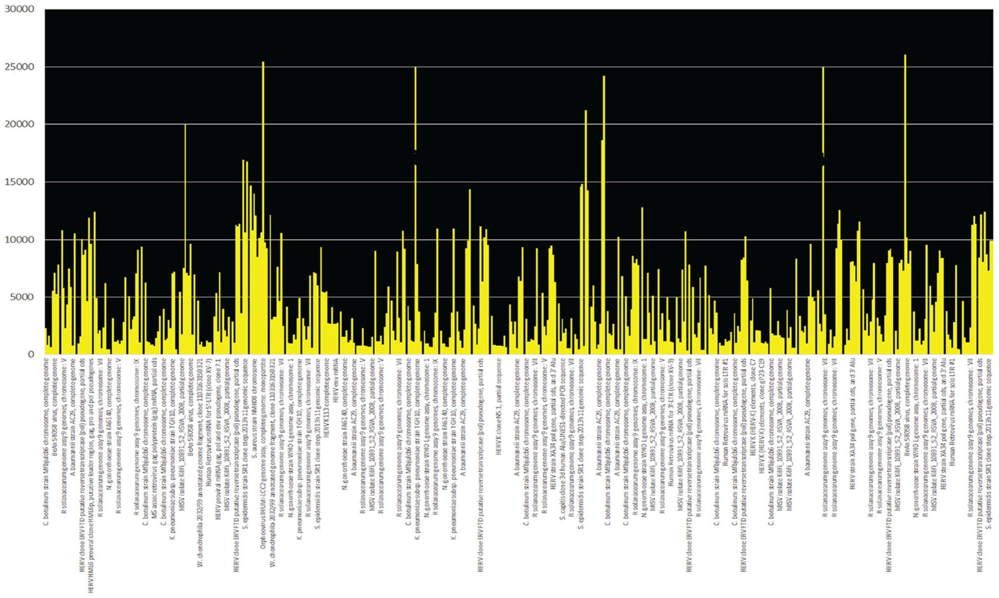 Genome rearrangements for patient data 1 produced 1986 matches to microbial sequences (range = 66%-100%) with E ⩽ e-10 and a mean value of 83% identity. About 190 Alu sequences resembled microbial sequences, supporting the idea that homologies among repetitive human sequences and microbes are real. Correspondence between microbial sequences and multiple human repetitive sequences increases possibilities that microbial sequences can interfere with essential human processes. Contamination of microbial DNA sequences by human Alu elements 50 was ruled out by comparing about 450 AluJ, AluS, and AluY sequences with all viruses and bacteria in the National Center for Biotechnology Information (NCBI) database.