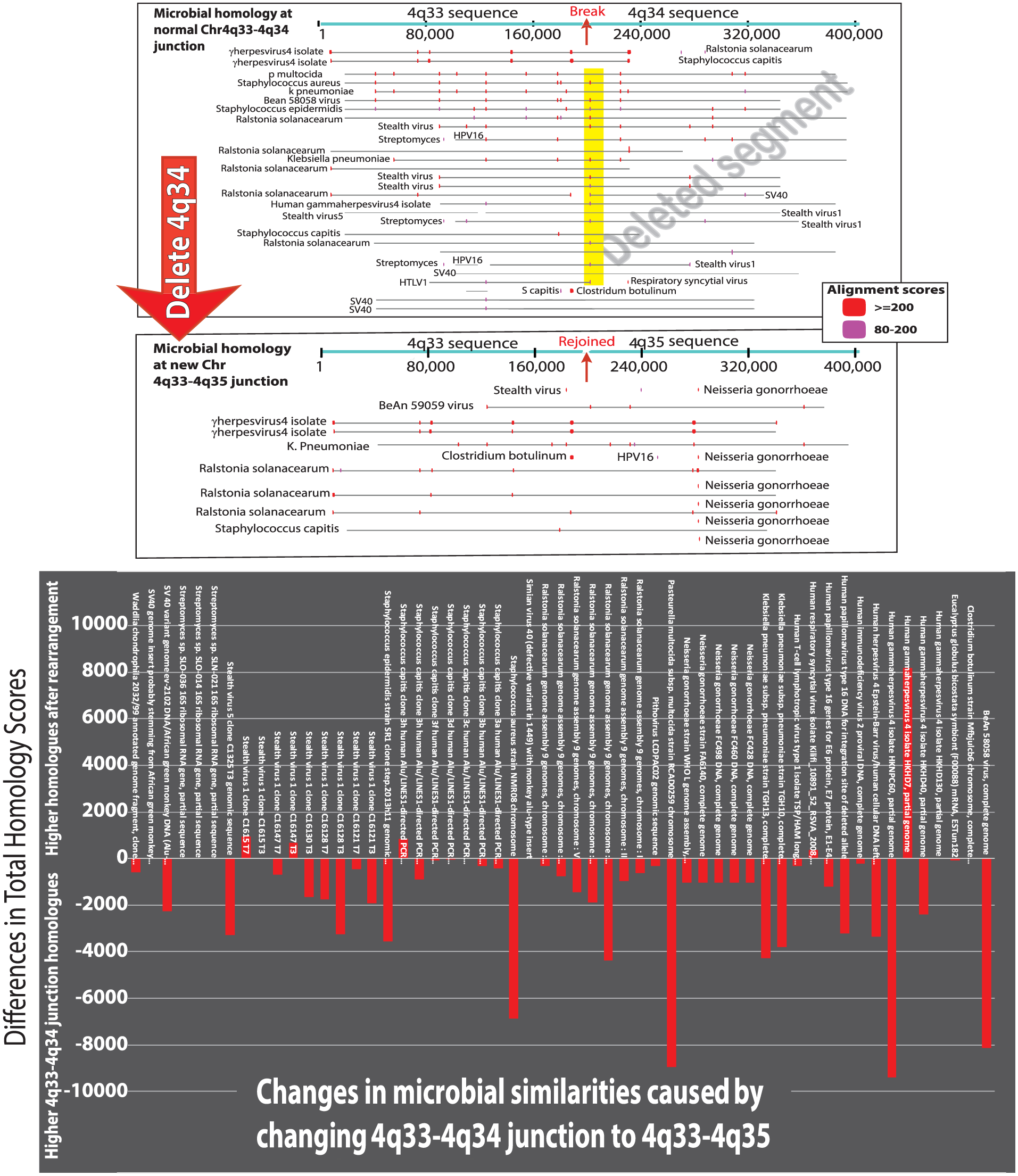 Figure 3 represents a snapshot of how local homologies to foreign DNAs shift when a chromosome segment is deleted. Figure 3 (top) represents 200,000 bps on each side of the normal 4q33-4q34 junction and its change after the 4q34 deletion to the new junction 4q33-4q35. Around the breakpoint and 3′ to it, microbial homologues become very different. Although the representations of microbial homologies as red rectangles appear to be small on Figure 3 (top), the matching sequences actually extend for hundreds of base pairs. Normally, there are multiple homologies to a variety of microorganisms at the breakpoint (yellow rectangle) which may help destabilize the area. After the deletion, the junction formed now has new and strong homology to pathogens