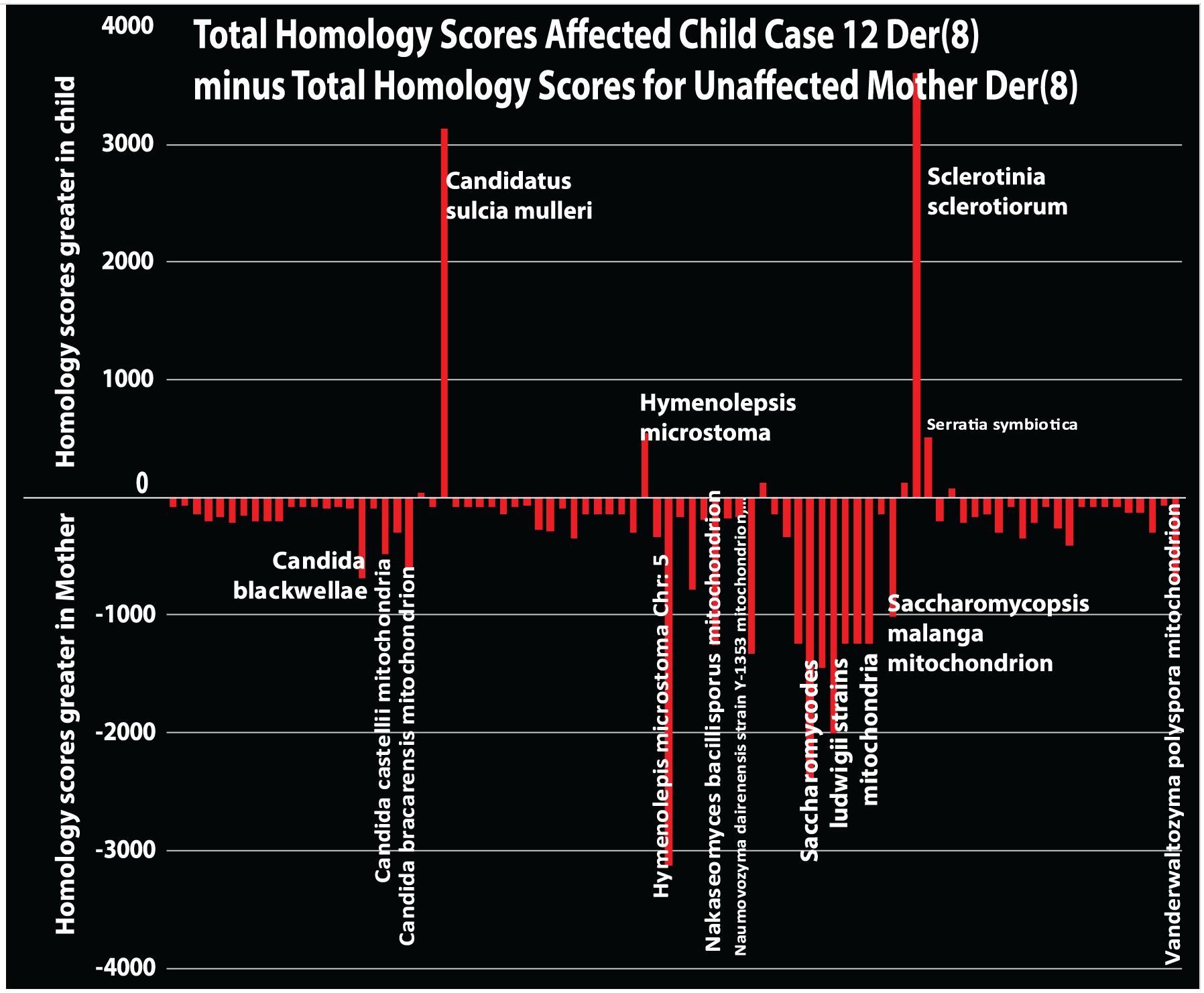 with different homologies than are present in affected cases (Figure 5). The distributions of homologous microorganisms are clearly different for the unaffected mother vs affected Case 12 Der(8) (Mann-Whitney,